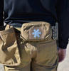 The pouch is accessed via a two-way zipper. Inside there is a velcro panel for mounting the Med Insert, two elastic ribbon loops, two Paracord loops, and a mesh pocket with an elastic drawstring. The pouch is available in several colors, has a velcro panel with a reflective paramedic cross embroidered, a detachable hip belt, and in the bottom part, three ribbons and an elastic drawstring. It is MOLLE/PALS-compatible.