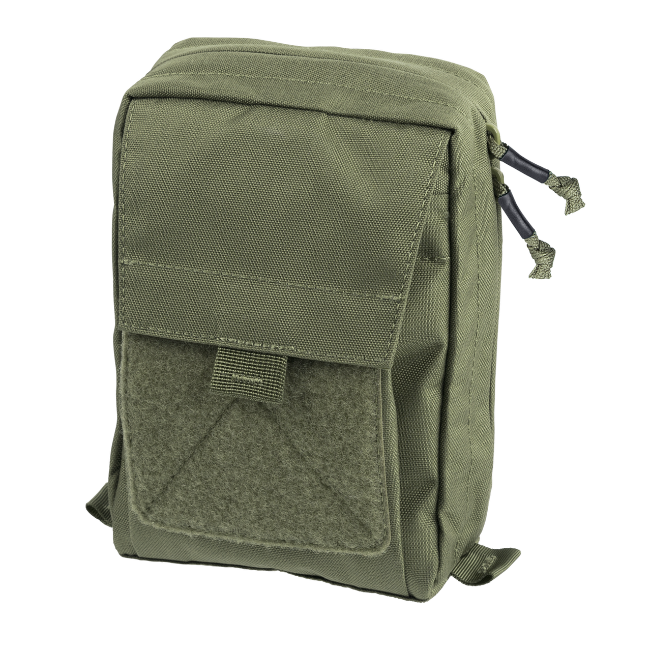 The internal pocket closes with a velcro patch, has five flat pockets, one elastic drawstring pocket, and several elastic bands to slide items beneath, a D-ring and an internal zippered pocket. The outer part of the pouch has a zippered pocket, two small flat pockets, a paracord handle, and four elastic bands. There are two elastic opening limiters to prevent the full opening of the pouch and items from spilling out. The Admin Pouch can be worn on the belt or integrated with MOLLE/PALS.