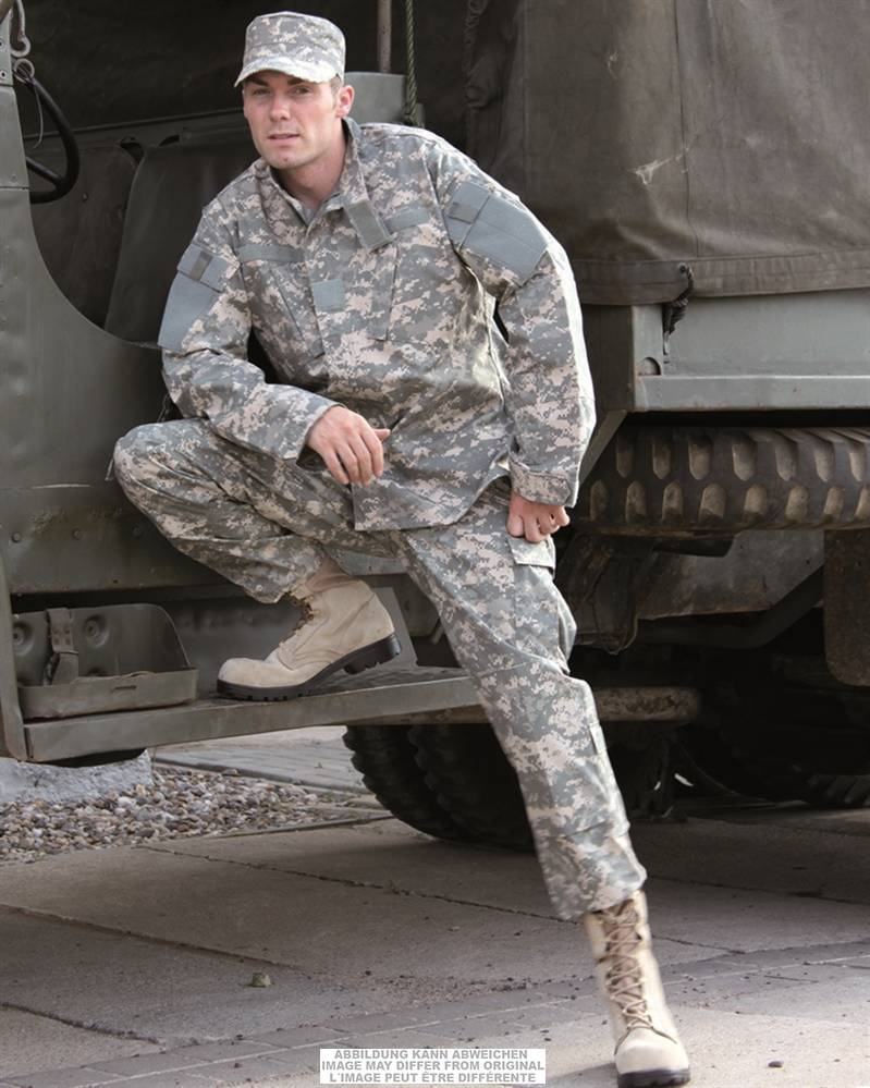 US military military surplus, digital camouflage. It has two inclined pockets at the chest and two shoulder pockets, covered with velcro. At the level of the left hand, above the cuff, the shirt has three spaces for storing writing instruments. Also, reinforcements can be inserted at the elbows and the sleeves can also be adjusted with the help of velcro. The closure is made with a durable zipper, in two directions, and with velcro straps. You can attach a Name / Country / Rank patch.