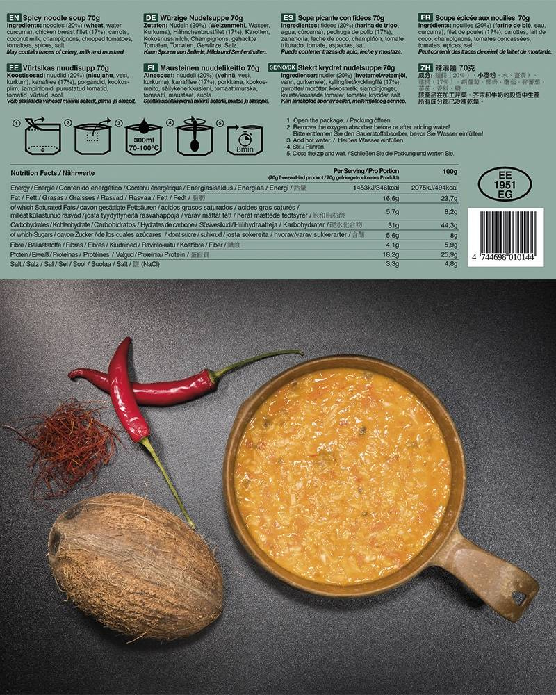 noodles (20%) (wheat, water, curcuma), chicken breast fillet (17%), carrots, coconut milk (coconut extract 85%, water), champignons, chopped tomatoes, tomatoes, spices, salt