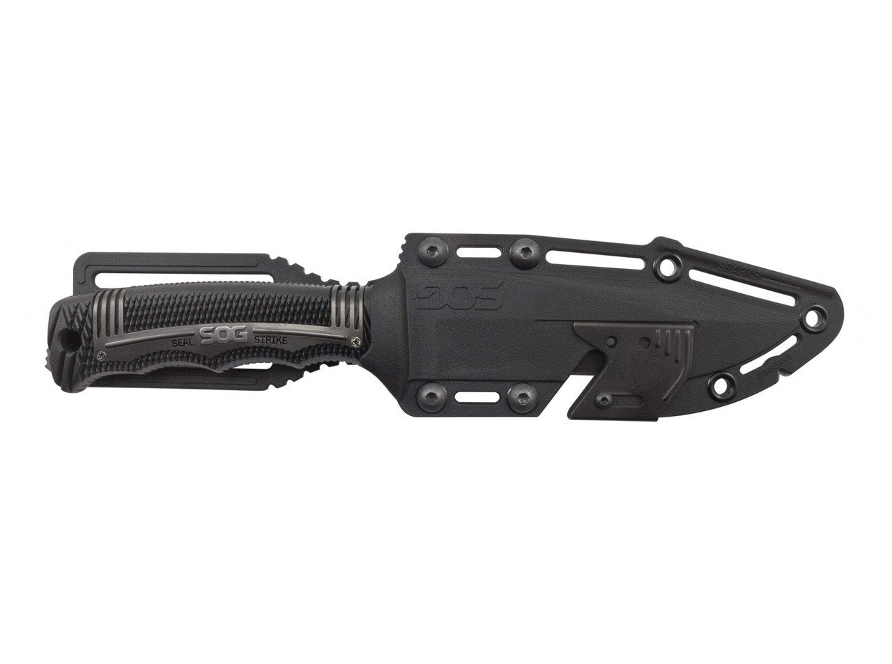 This representative of SOG's legendary Seal series not only convinces with its elaborate and extremely non-slip handle with steel insert whose end has an integrated impact element. The aggressively serrated blade is coated with titanium nitride and is extremely resistant to corrosion. The multi-purpose plastic sheath can therefore also withstand underwater use. The sheath has been given special attention, which is why it is not only used to store the knife. A removable belt adapter attaches the sheath to the belt either directly or with a steel clip. When the belt adapter is removed, particularly large openings are used for easy installation, for example of a Tek Lok. A sliding steel element covers a pocket that allows the knife to be safely used as a belt cutter when in the sheath. A sharpener and fire starter are also safely integrated as captive elements in the sheath. A true all-rounder that remarkably enhances the functionality of the sheath or sheath-knife unit, without burdening the carrier with additional weight or packing volume.