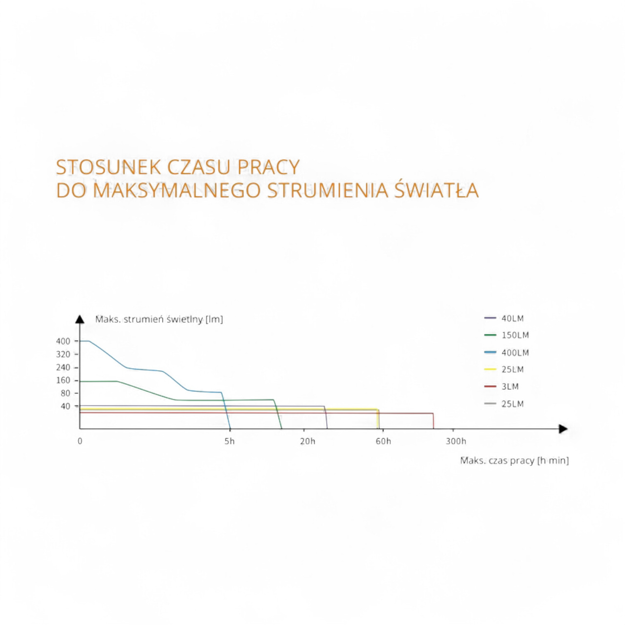 The flashlight provides white and red light. The maximum white light output is 400 lumens, with a battery life of up to 5 hours in this mode. The following modes are also available: medium (150 lumens), low (40 lumens), dim 1 (3 lumens), dim 2 (25 lumens) and front directional light (25 lumens). The red light operates in two modes: continuous (1 lumen) and flashing (1 lumen). The wavelength of the red light (622-720 nm) allows visibility from distances of up to 500 metres.
