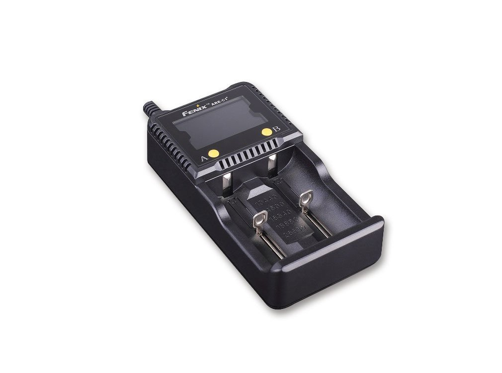 Fully electronically regulated two-slot charger with individual slot controls. Displays charging current, battery voltage, and charging time for each slot. Lit LCD display can be turned off. Compatible with 3.7V Li-Ion batteries (18650, 16340, 26650, 14500, 10440) and 1.5V Ni-MH and Ni-Cd batteries (AA, AAA, C). Power supply 230V. Optional 12V car adapter. Dimensions: 145 x 75 x 39 mm