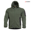 100% polyester 140Gsm Fleece Hoody with a natural knitted wool appearance texture and fine inner fleece backing, hand and arm pockets are seamlessly bonded with hard-shell fabric.