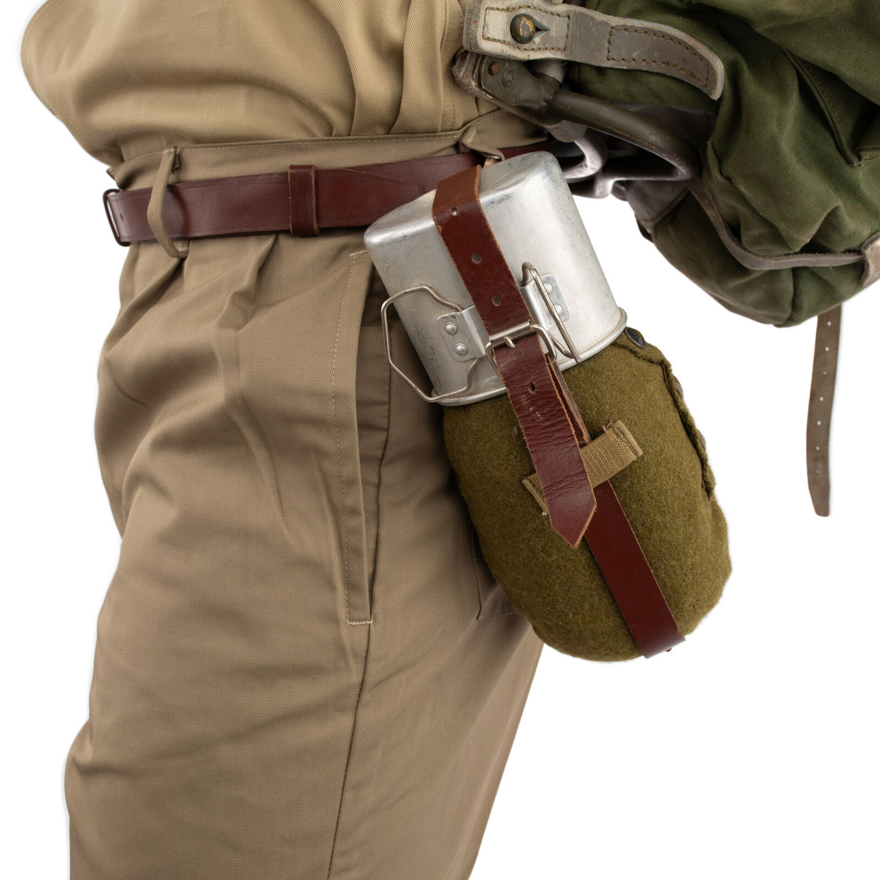 Campaign Canteen with cup with foldable hadle attached to it. Made out of aluminum, has a canvas cover and leather straps with metal carabiner to attach to belt or haversack. Romanian Military Surplus.