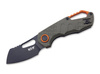 The short clippoint blade is made of N690 and has a robust stonewash finish. It is opened using the flipper or the elongated thumb opening and a liner locksecured. The non-slip gray plastic handle has a textured surface and thanks to the ergonomic recessed grips, it sits securely in the hand even when wet. With convertible wire clip (tip-up / lr).