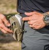 The internal pocket closes with a velcro patch, has five flat pockets, one elastic drawstring pocket, and several elastic bands to slide items beneath, a D-ring, and an internal zippered pocket. The outer part of the pouch has a zippered pocket, two small flat pockets, a paracord handle, and four elastic bands. There are two elastic opening limiters to prevent the full opening of the pouch and items from spilling out. The pouch can be worn on a belt or integrated with MOLLE/PALS.