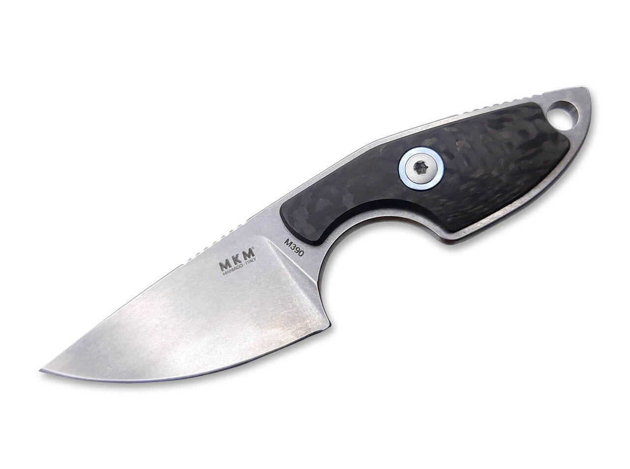 MKM Mikro 2 CF is small but beautiful. The Neck Knife designed by Jesper Voxnaes has a sheepfoot blade made of high-strength Böhler M390. The non-slip handle made of carbon fiber lies securely in the hand even during difficult cutting work. With high quality leather sheath and lanyard.
