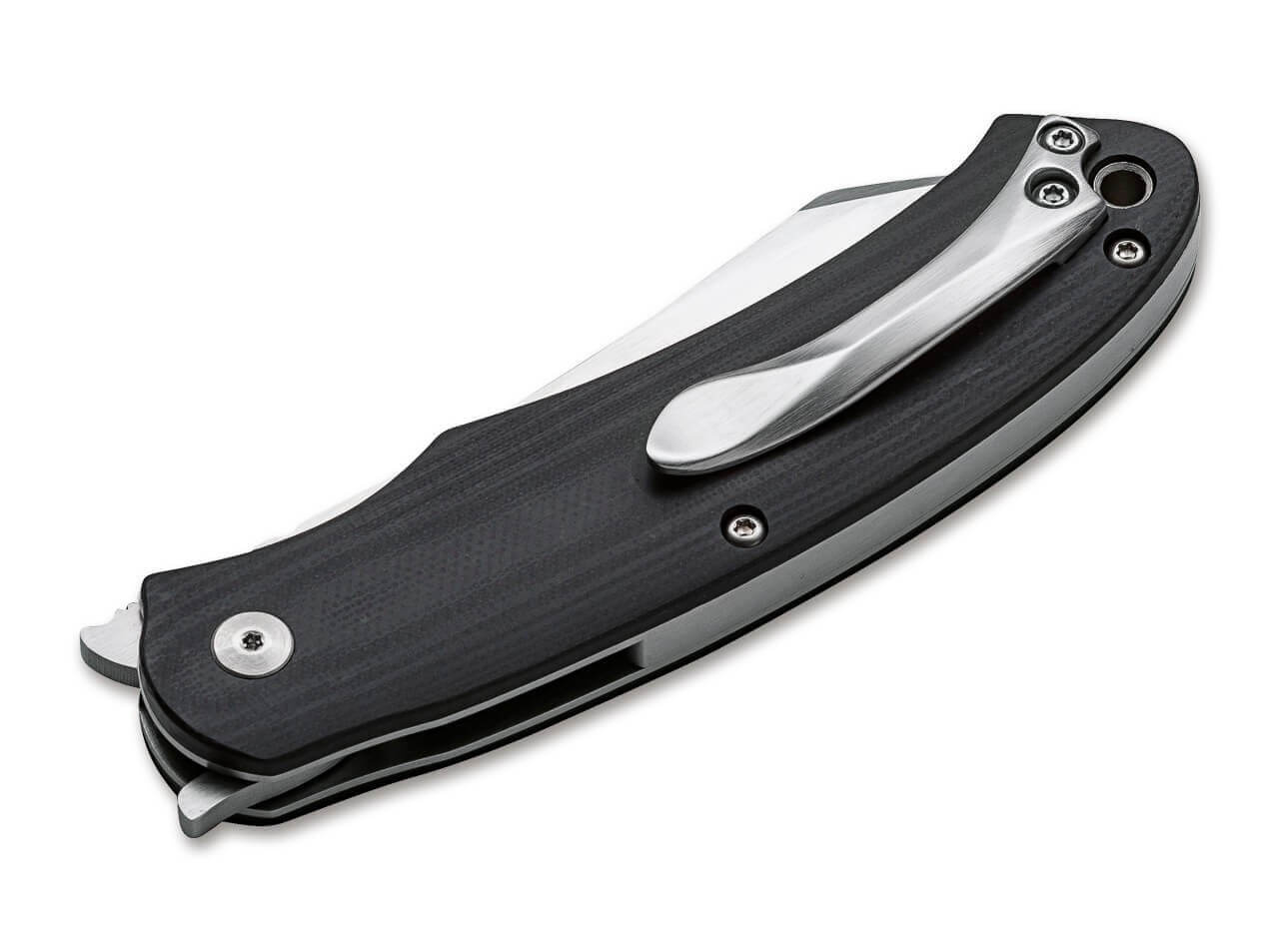 Kansei Matsuno is known for his very slender and lightweight designs, where he combines Japanese style elements with modern construction and materials. With the Boker Plus Takara, the custom knifemaker presents a much more solid gentleman folder that still features the same elegant lines. The size of the slightly curved knife is the perfect blend of pocket size and versatility. The D2 blade has a fine lengthwise satinized finish with decorative filework on the spine that also serves as a thumb rest. It rests on ball bearings and opens with the front flipper that is typical for the Japanese knifemaker's designs. The blade is secured with a sturdy linerlock. The slightly contoured handle scales are made from textured G10 mounted on solid stainless liners. The full-length spacer also consists of stainless steel, creating an elegant contrast to the dark scales. A black leather lanyard and 3D CNC-milled clip complete the design.