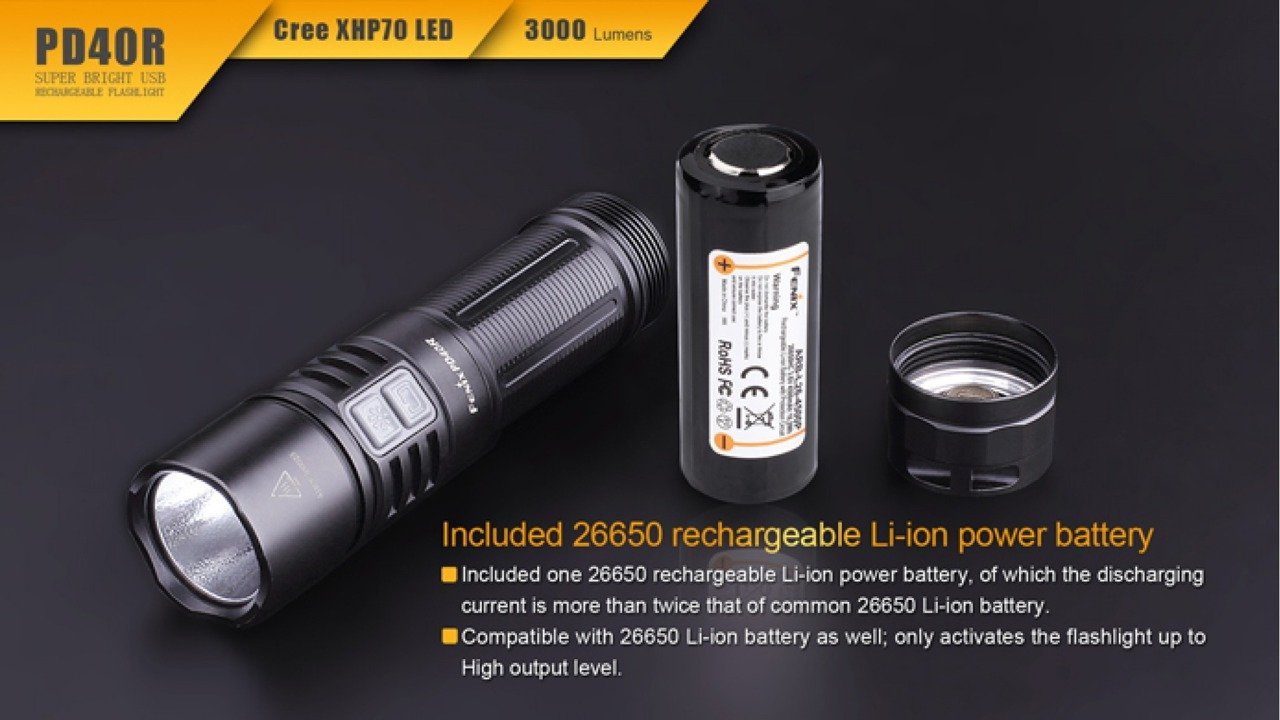 The PD40R by Fenix is an extraordinary high-performance light. The very compact design together with the special high-performance battery makes a burst turbo mode of 3000 lumens possible. 4 additional light levels (1000/350/100/20 lumens) plus strobe and SOS. The extremely wide light cone ensures an impressive field of illumination. The integrated USB charging function makes it possible to charge the special battery (format 26650) in the light via the completely water-proof, embedded micro-USB port (IP68). Dual side switch with integrated charging and battery status display. Delivery includes a high-current capable 26650 battery, holster, charging cable, hand sling, and spare seal. The PD40R can also be operated with a normal 26650 battery but only at a maximum of 1000 lumens. Diameter: 34 mm (point) / 30 mm (body).