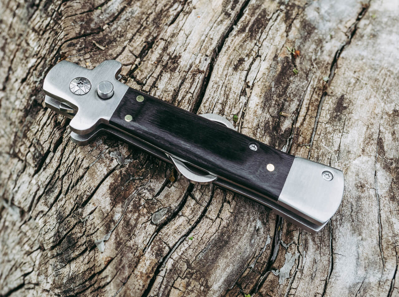 The Magnum Auto Wingman Bottle Opener is certainly one of the coolest tools for removing bottle caps. With the push of a button, the sturdy bottle opener snaps out of the pleasantly shaped handle with scales of dark Pakkawood. Without clip.