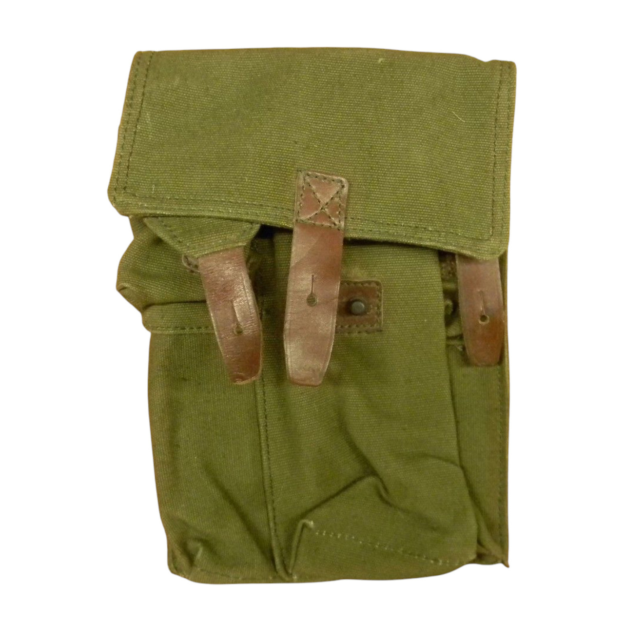 The pouches measure approximately 10 inches by 7 inches by 3 inches and are constructed from a tough, olive drab canvas material that has held up very well through the years. They are two-chambered pouches, meaning that each magazine slips easily into its own chamber within the pouch. An oversized closure flap serves to protect the magazines and is secured via a slotted strap and stud fastener. As noted, there is an exterior pouch that is designed to hold an oil bottle for the AK-47. This pouch could also be used with other small accessories.