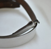 Military belt made of natural leather dyed white with a black buckle. The belt is a military surplus from the stock of the Romanian army (condition: used).