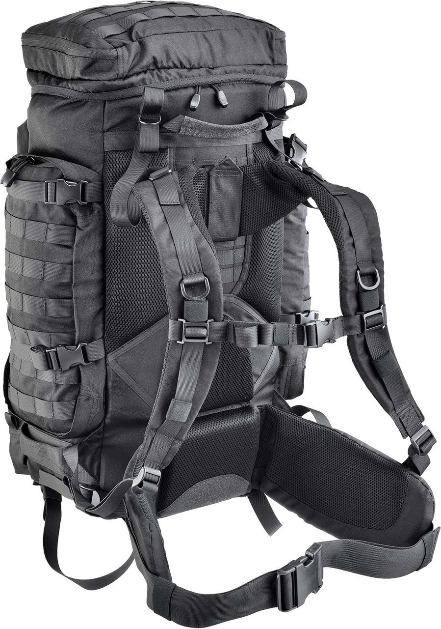 The backpack is structured by the main pouch and four other large pockets. The dorsal part is designed to give maximum comfort to the user. The two outer hooks, perpendicular to the axis of the dorsal, allow the fixation of material to the outside of the backpack, also helped by an adjustable elastic. It has a double carrying handle and evacuation reinforced with non-slip material, providing greater "grip" in the socket. Interesting is the top pocket, completely independent from the rest of the bag, allowing easy access to basic necessities, keeping it tidy and well divided. The MOLLE system allows you to attach additional tactical pockets, providing the operator with a complete organization of its material. The lumbar belt is padded and can be adjusted by straps and sliding buckles.