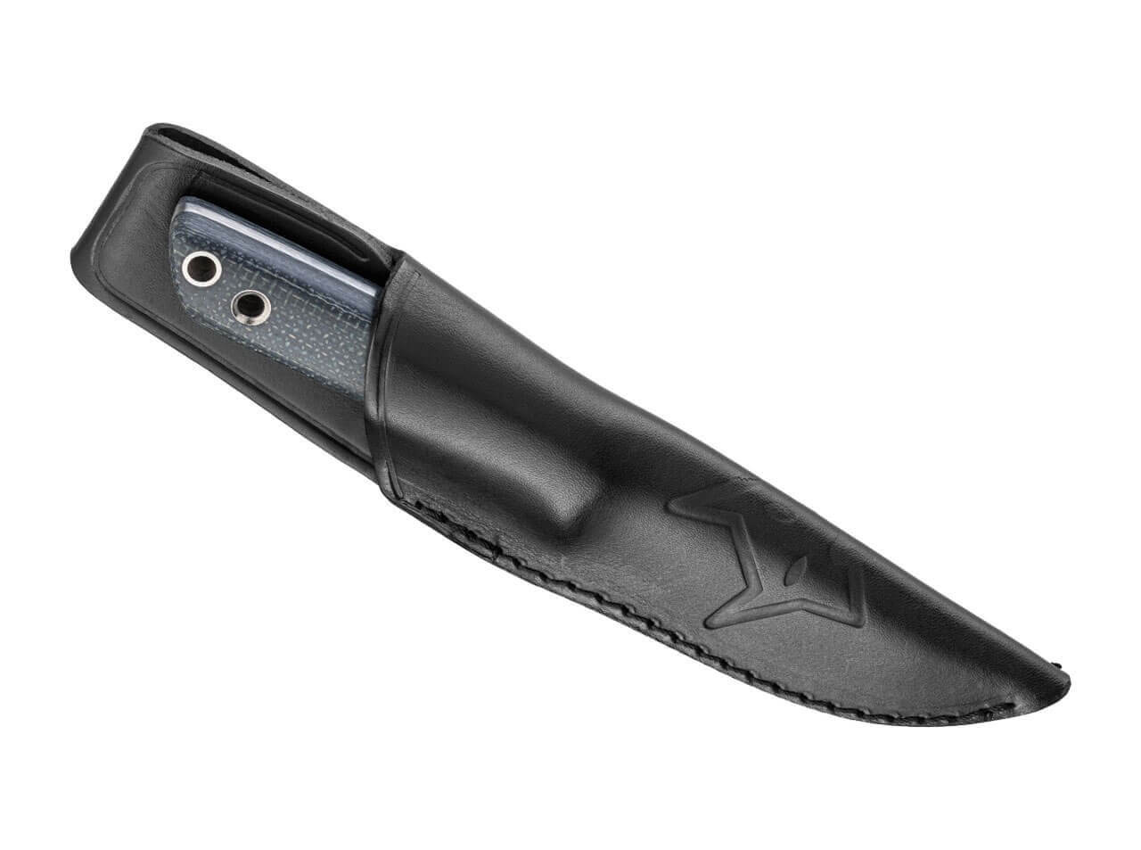 The compact everyday knife is a modern interpreter of a Persian knife. The upwardly curved blade made of Niolox, which is characteristic of this type of knife, is suitable for a variety of cutting work and has a noble satin finish. The straight handle is made of Black Yute Micarta and has three eye-catching holes that combine weight savings with flexible mounting options. With leather sheath.