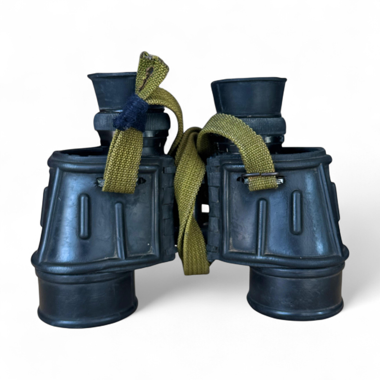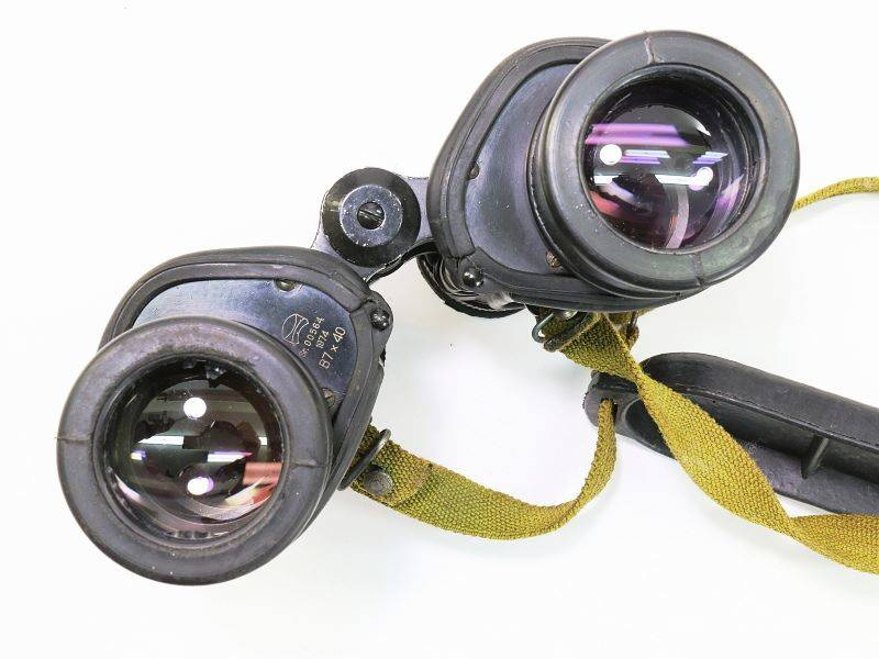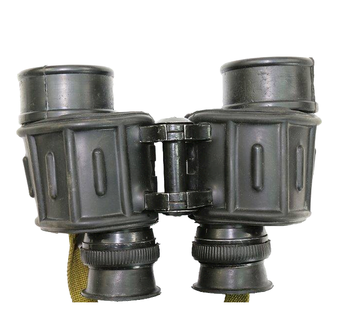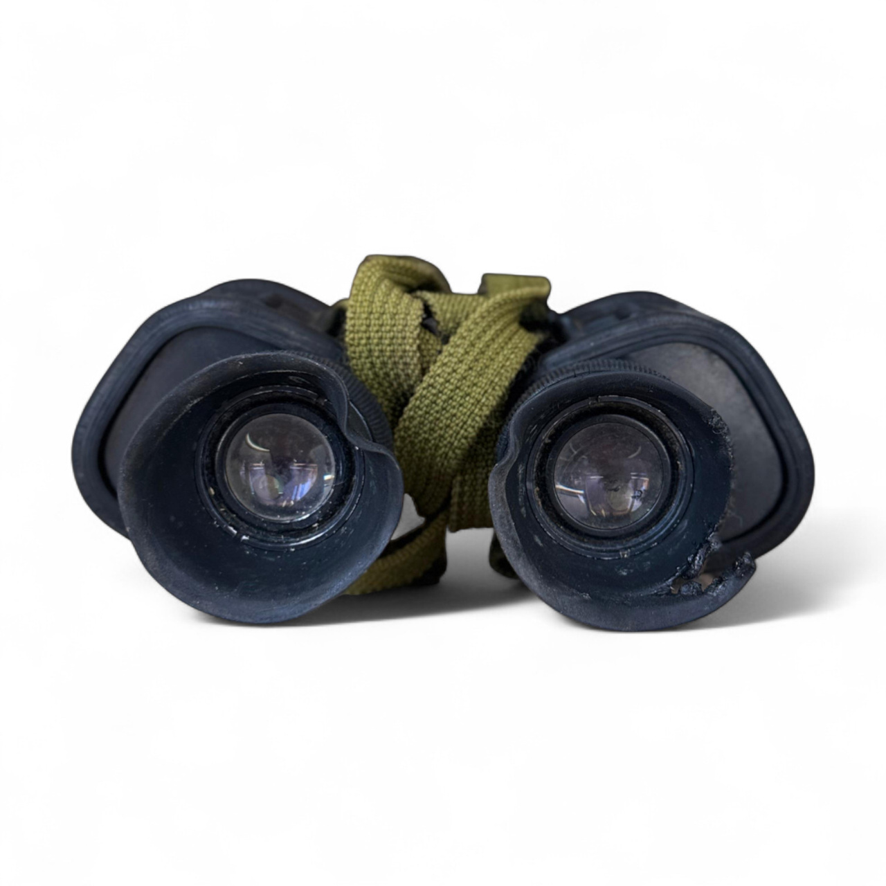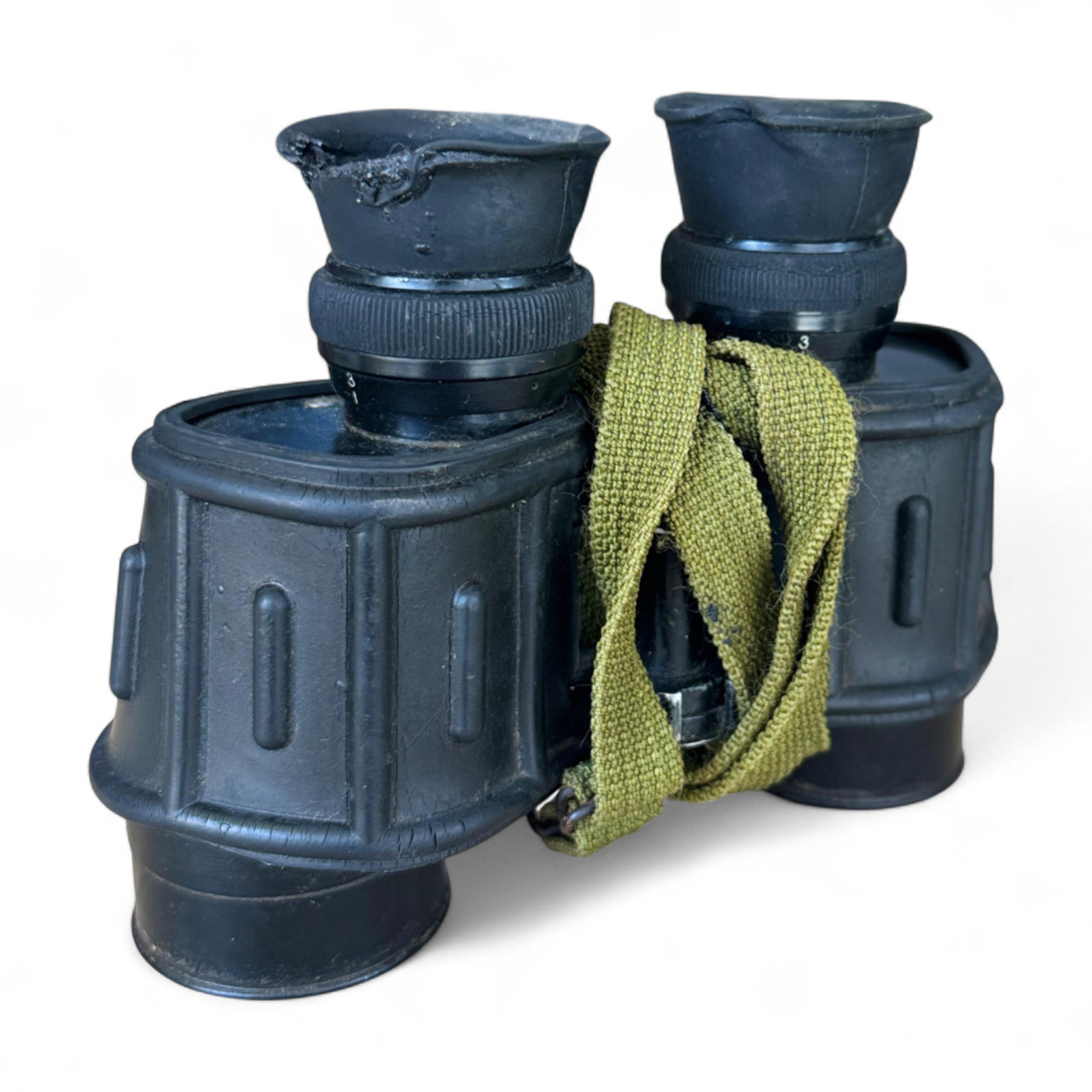 Overall, the binoculars have a distinctly military aesthetic, with the typical patina of equipment used in the field. It may be of interest to collectors or for props, but it requires reconditioning for practical use.