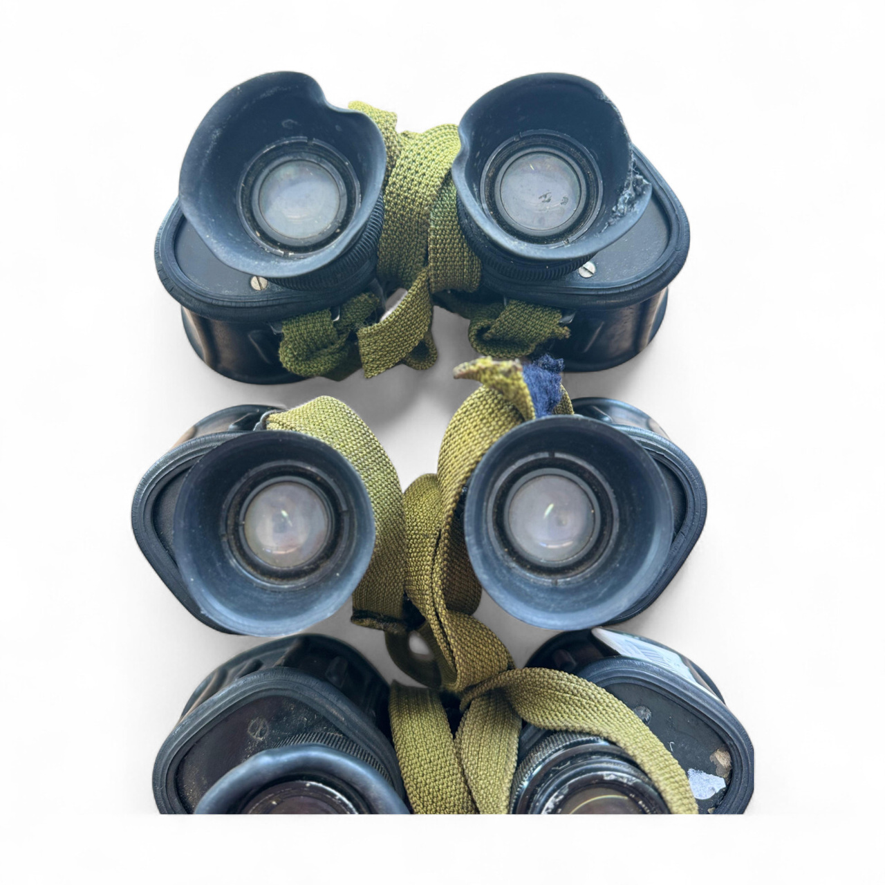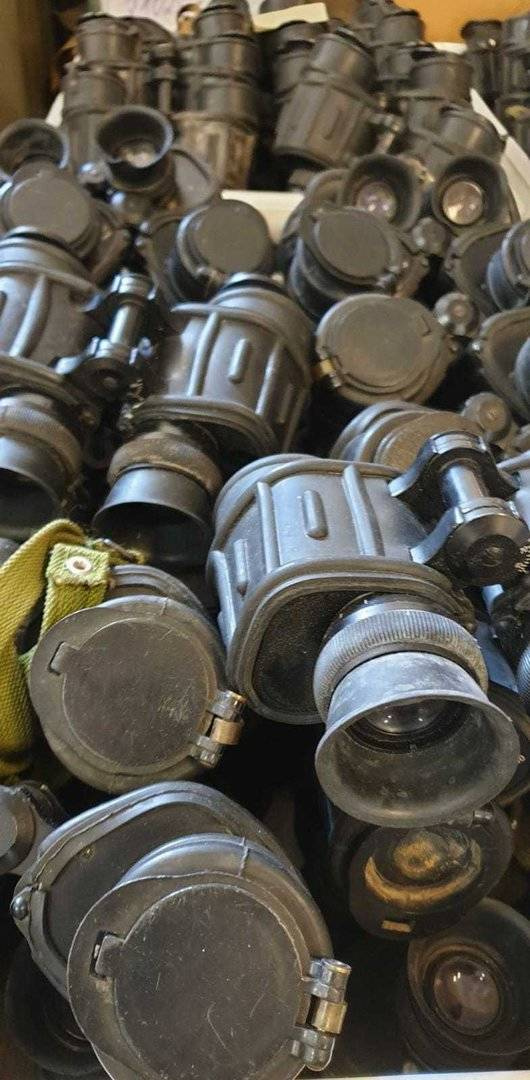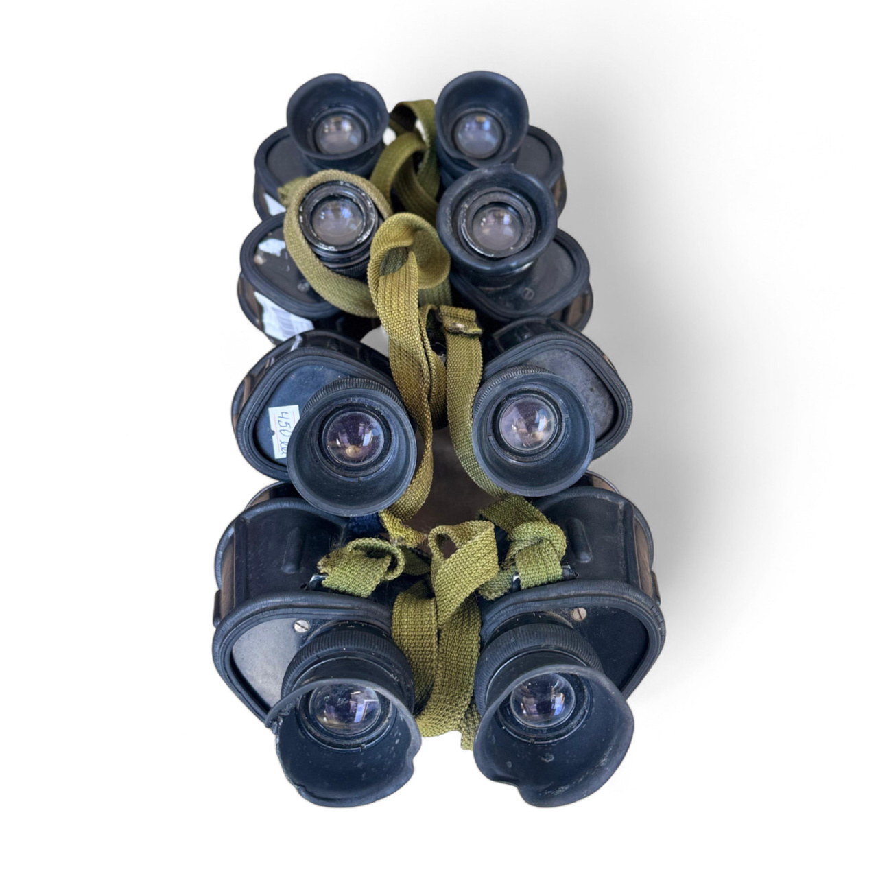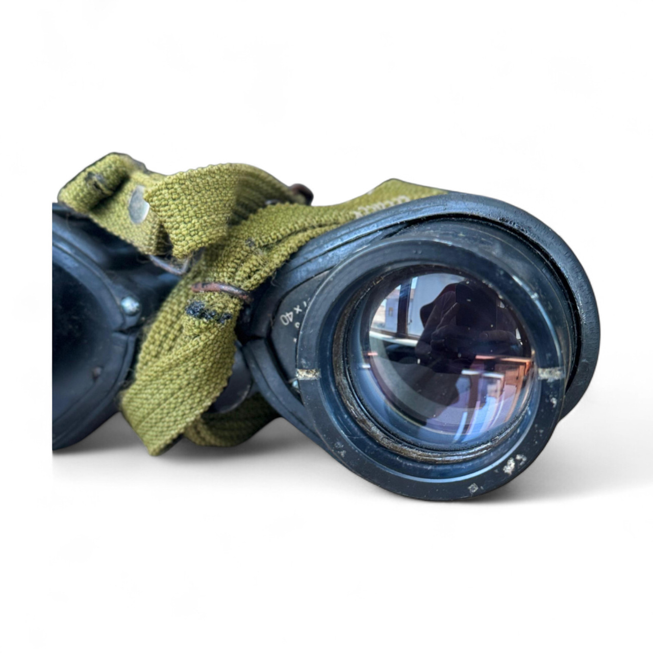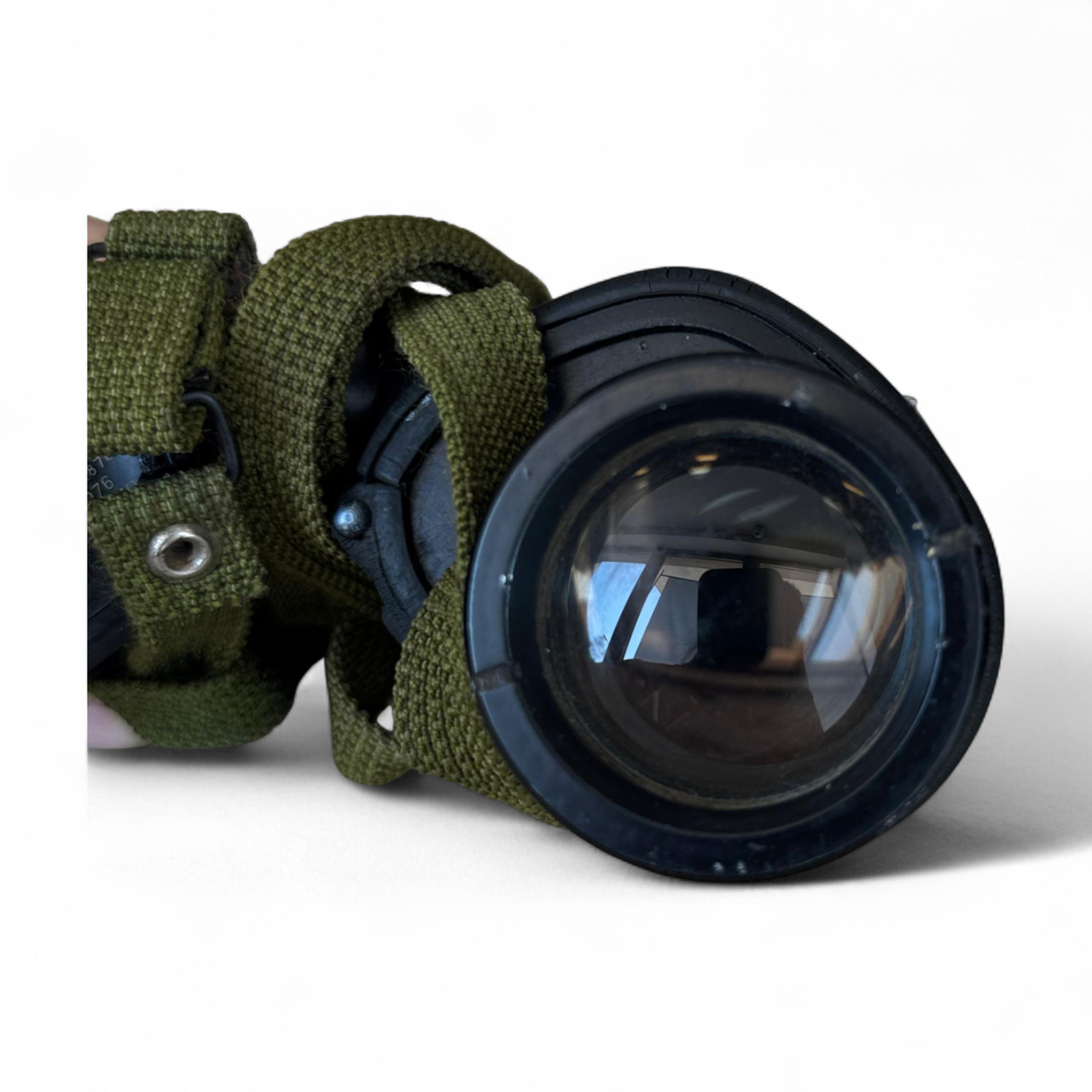 Overall, the binoculars have a distinctly military aesthetic, with the typical patina of equipment used in the field. It may be of interest to collectors or for props, but it requires reconditioning for practical use.