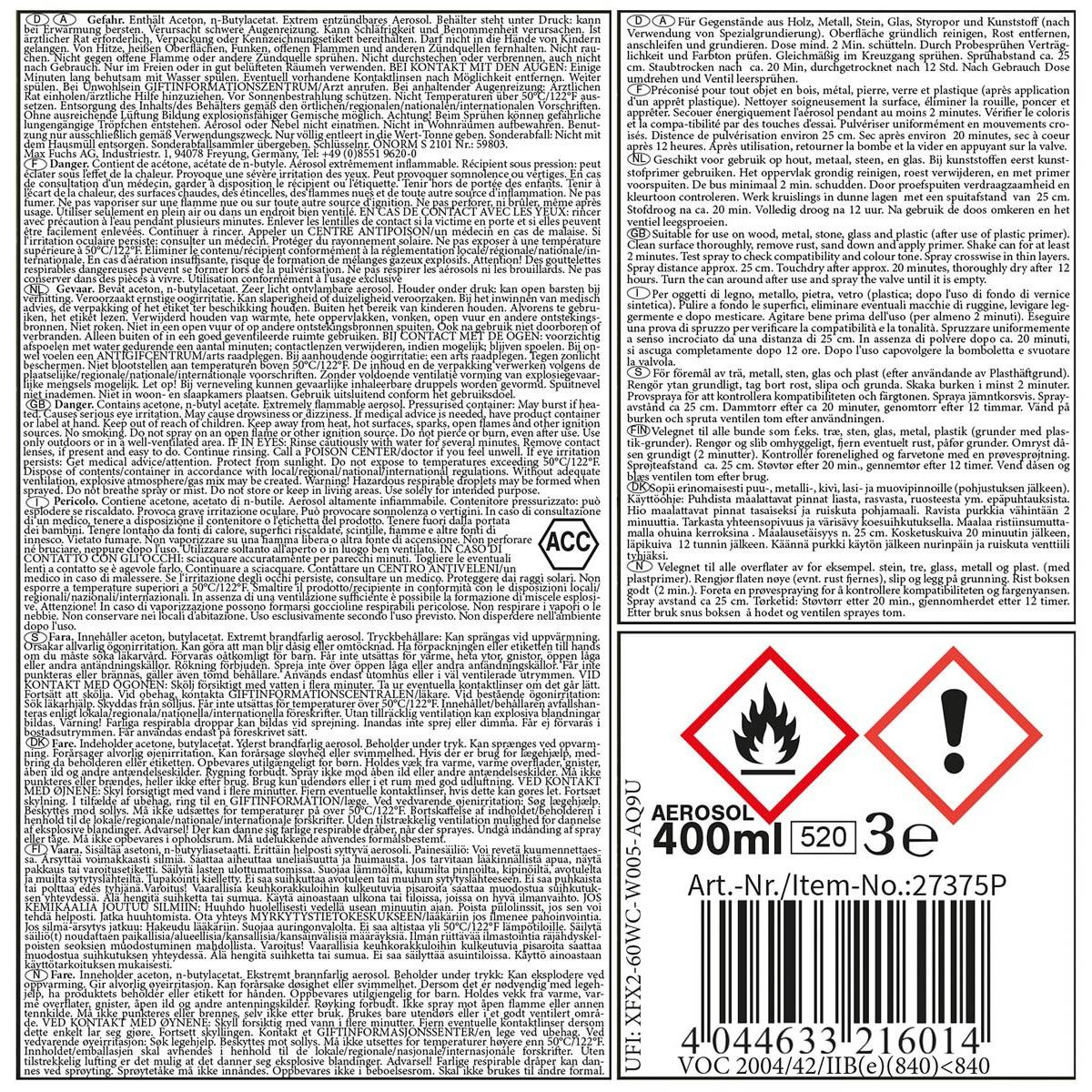 - contains: Acetone, n-butyl-acetate - pressurized container, highly flammable!