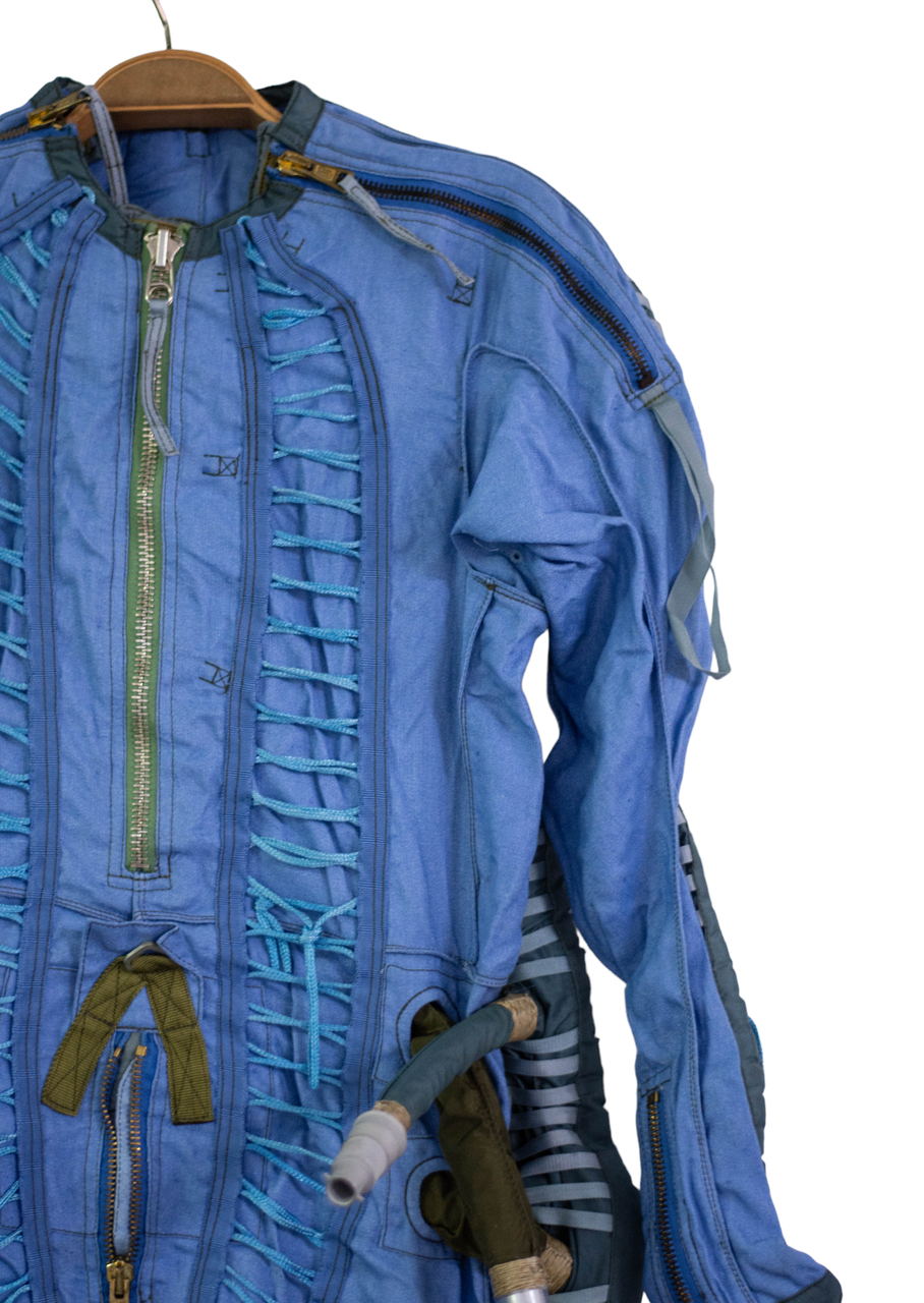 This is a G-suit used by the MIG fighter pilots to help compensate for gravitational forces in high-performance flights. This early partial pressure suit has tubes running down the arms, legs, and back to aid the pilot by increasing pressure to prevent blackouts under high G maneuvers.