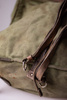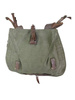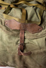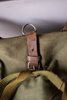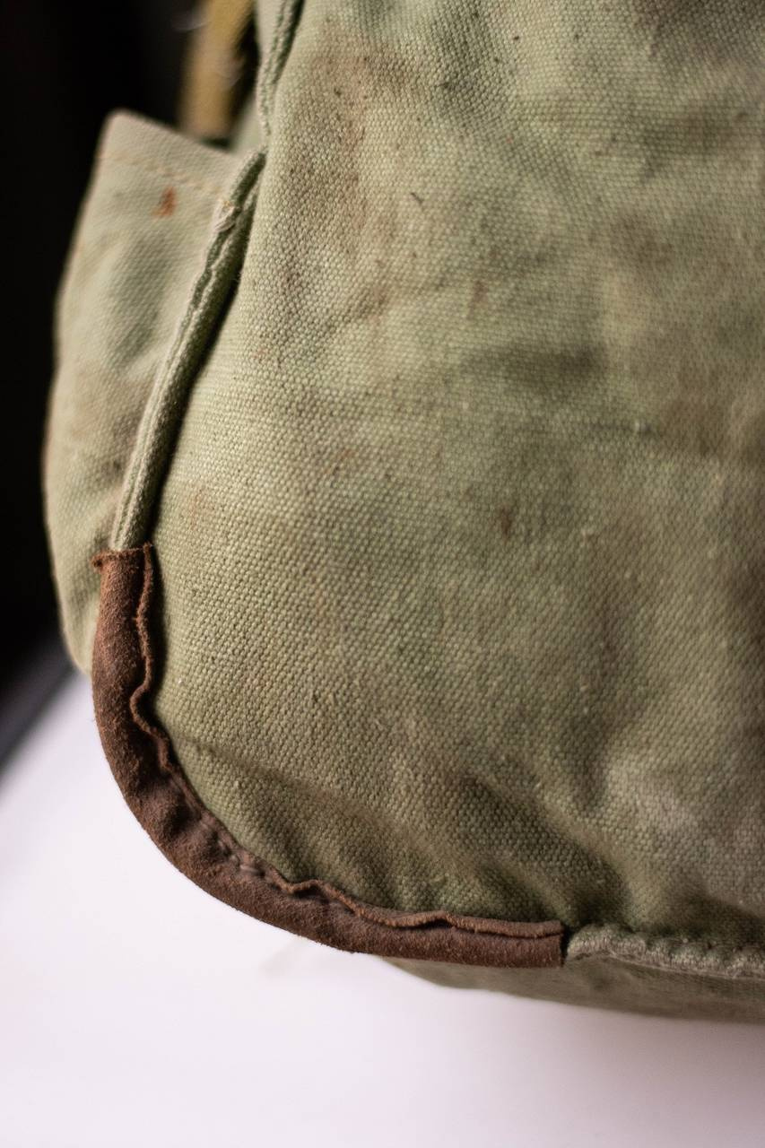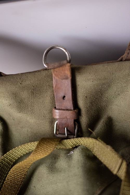 This genuine like new military backpack is made from sturdy heavy duty canvas in army green shade. The leather shoulder straps are adjustable and wider on the shoulder for comfortable wearing. The bag is quite big and can hold a lot of your stuff in it, it also has a leather belt and a fabric pocket on one side where you can carry a big water bottle, a tripod or a paper storage tube for example. It closes with a cord on the inside and fastens with a leather strap with metallic buckle on the outside. It has a lot of small leather loops all over, on this loops the military equipment like helmet and tent were attached.