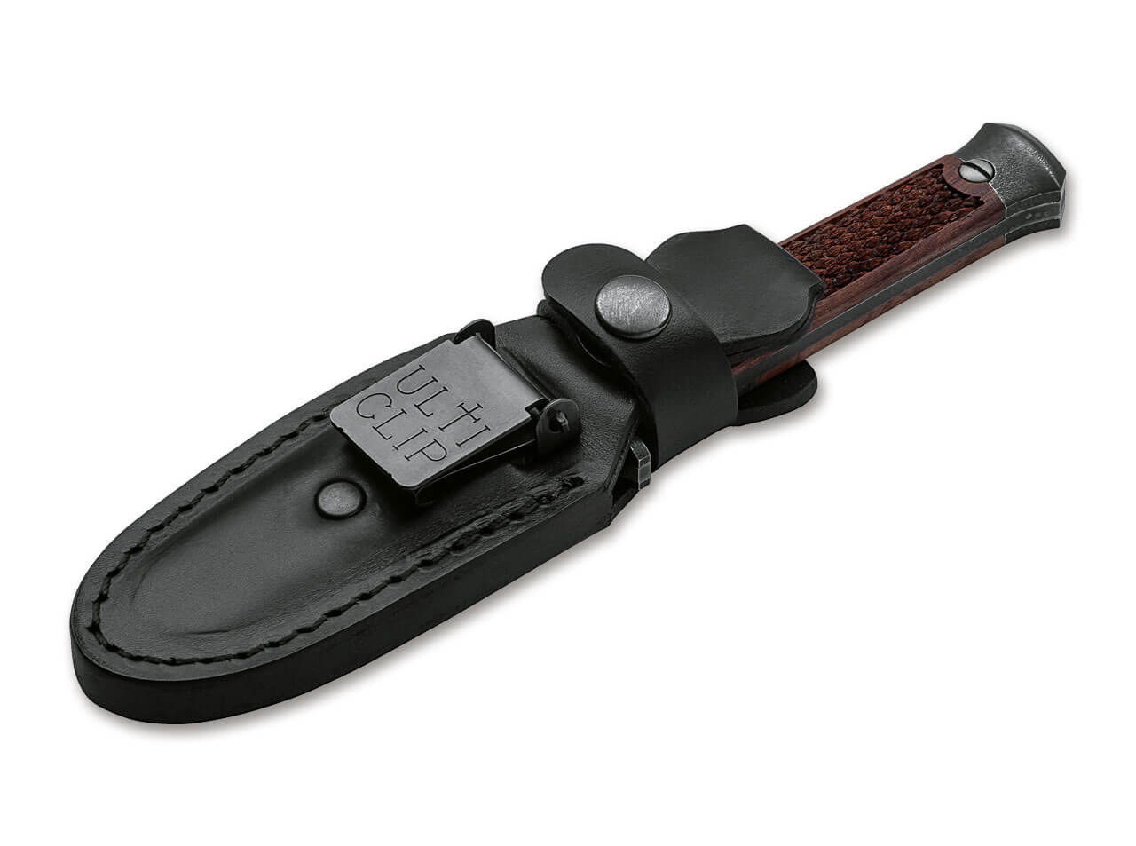 The bolsters and end knob are made of steel and are finished with a dark stonewash finish. Supplied with a high-quality black leather sheath with a sewn-in ulti clip and can be easily attached thanks to the locking spring clip. Thus the Boker P08-Damascus boot dagger can be pulled effortlessly while the sheath is reliably held in place by the Ulticlip. Handmade in the Boker Knife Manufactory in Solingen. With a noble floating display, certificate of authenticity, and individual serial number.