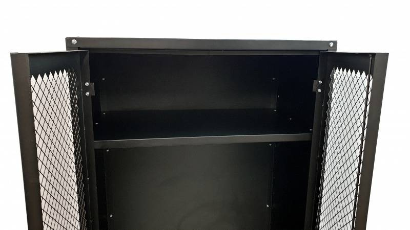 The TA-50 equipment cabinet includes 1.6mm thick steel shelves across the full width. The middle and bottom shelves are reinforced for an evenly distributed load capacity of over 70 kg. Holes are drilled in the sides of the posts to allow the shelves to be moved up or down by 100 mm. The ø20 mm round steel suspension bar under the shelf is perfect for hanging coats, uniforms, and even heavy field clothes. These equipment lockers are available in a matte black powder coat finish. The full size of the TA-50 locker is 2000 mm x 1000 mm x 600 mm.