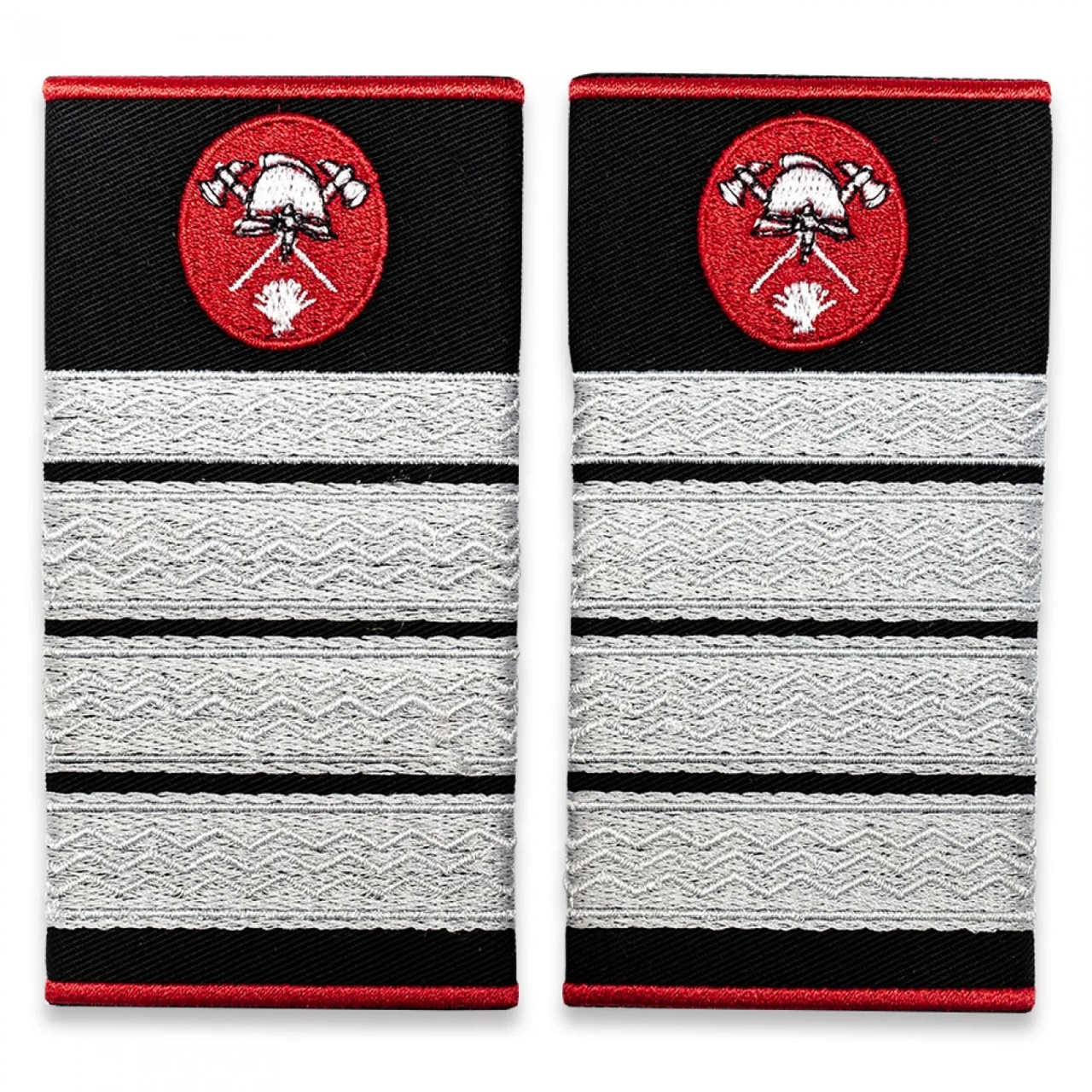 Gradele pentru Plutonier Adjutant Șef Pompieri ISU, IGSU sunt brodate pe două variante de suport textil.