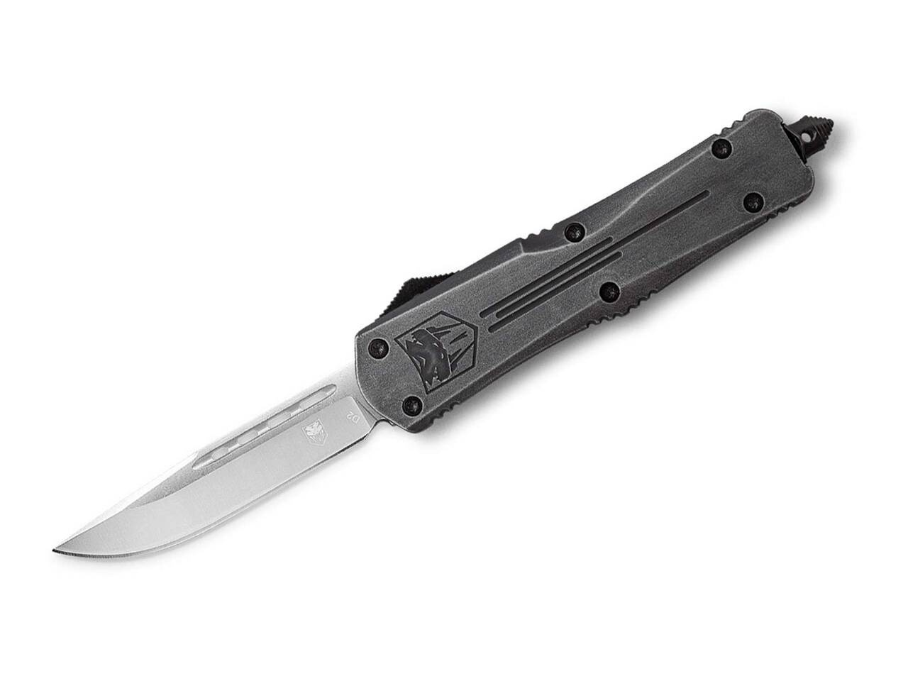 The full version of the popular FS-3 convinces with its solid D2 drop point blade, which emerges from the front handle as fast as an arrow at the press of a button and disappears there again when pressed again. The OTF (Out The Front) knife features a textured, high-strength aluminum handle that has a rustic stonewash finish. The deep wear clip is attached to the glass breaker hammer and allows for tip-up wear on both sides. Supplied with a high-quality nylon pouch.