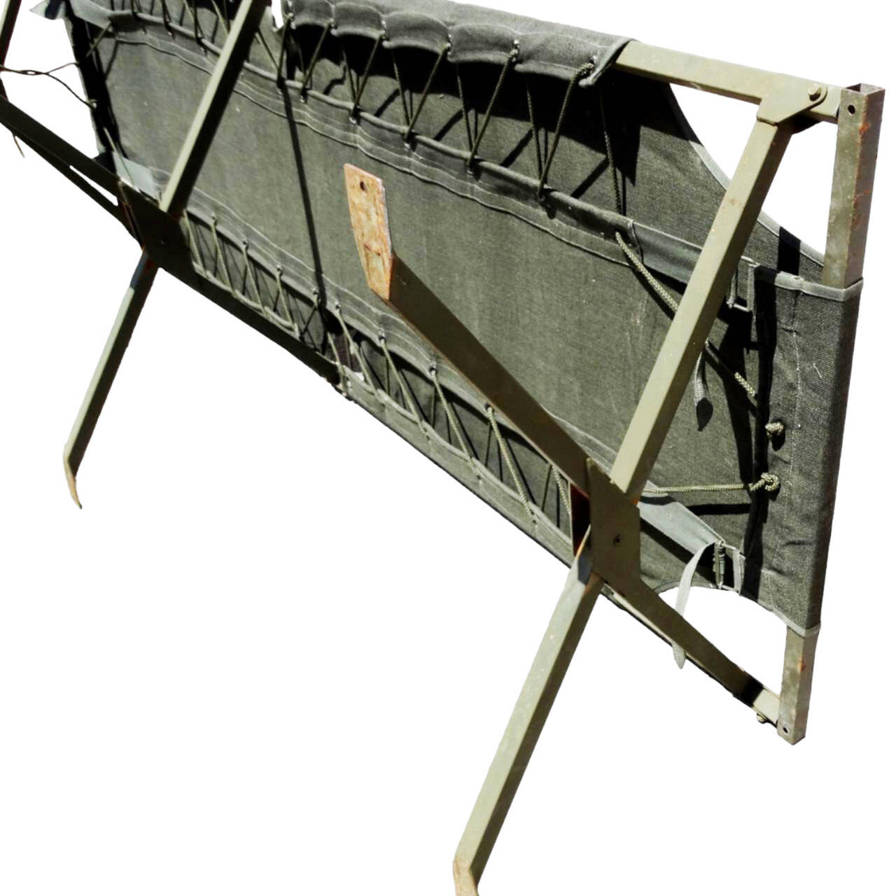Folding steel frame bed popular with hunters, survivalists, and collectors.