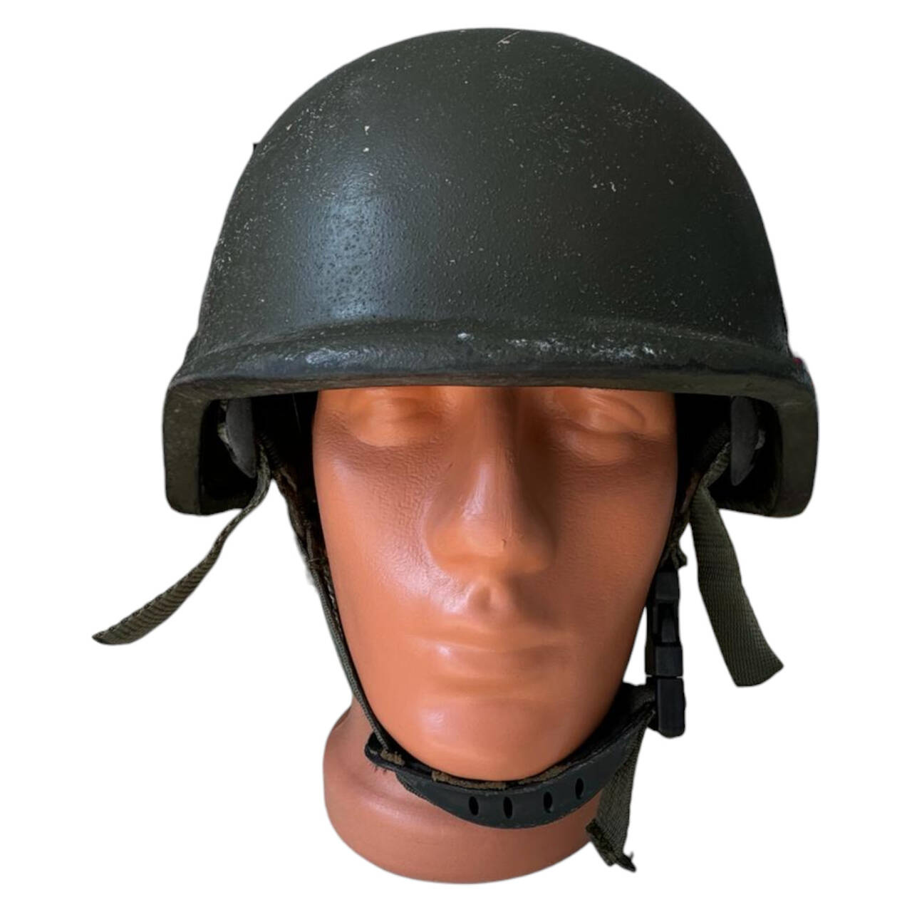 Used military surplus ballistic helmet in olive green, originating from equipment of the Romanian Armed Forces. Ideal for collectors, historical reenactments, training scenarios, or as a decorative/technical piece.