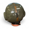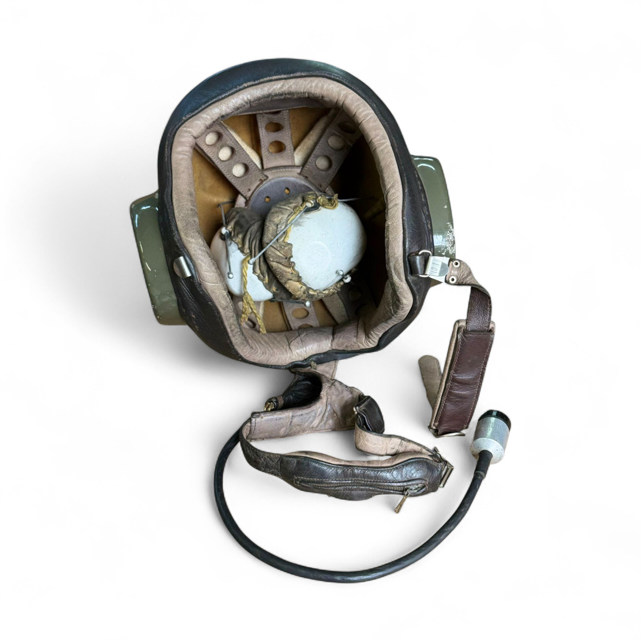 Authentic Czech Air Force helmet, sourced from military surplus, designed for helicopter crews. It is equipped with original lining, internal helmet with audio headphones, neck microphone, and connection cable.