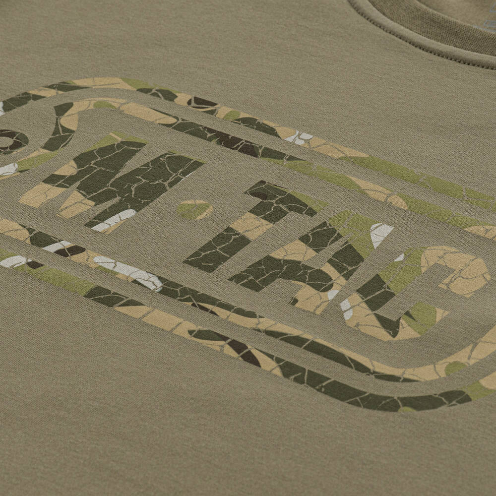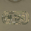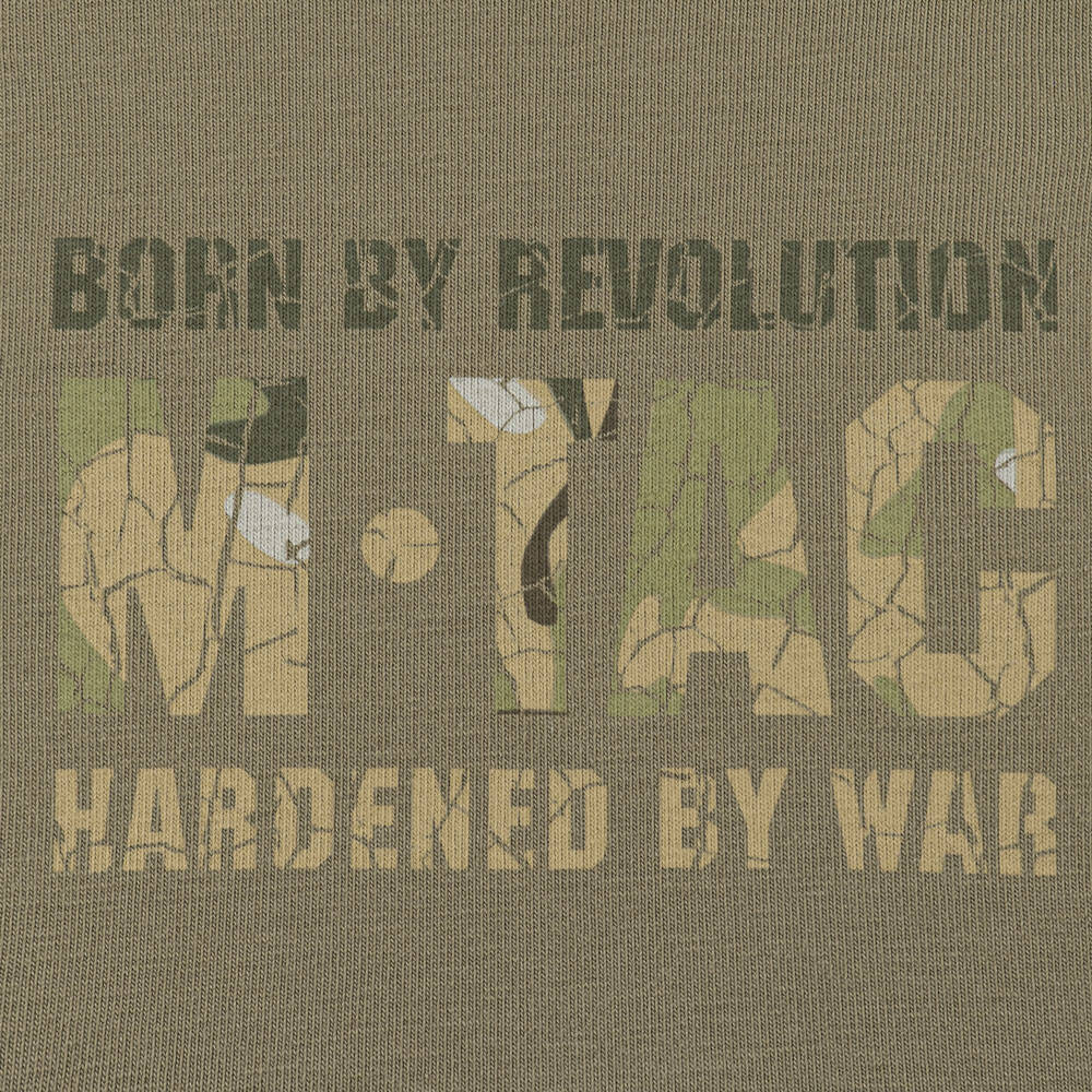 A feature of this model is a stylish camouflage print with the image of the brand logo, which is made in the corporate style and creates a crackle effect. On the sleeve of the T-shirt, next to the logo, there is the brand's main slogan: Born by Revolution – Hardened by War.