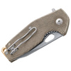 The extravagant Suru by Jesper Voxnaes looks good because it has the liner lock system as its locking mechanism. The pocket knife has a bulbous M398 blade, which can be opened with a flap or thumb hole. The green Micarta handle is harmoniously accented by a gold anodized backspacer, with a reversible tip-up clip and lanyard hole.