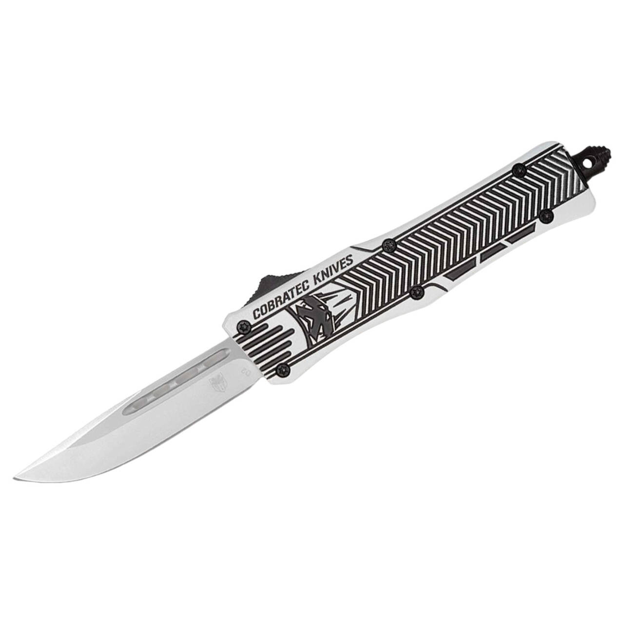 The small version of the popular CTK-1 impresses with a solid D2 drop point blade, which comes out of the front handle at the touch of a button and disappears again when pressed. The OTF knife (Out The Front) is equipped with a textured handle made of high-strength aluminum, which is kept in an artic white. The deep-carry clip is attached to the glass breaker and allows tip-up carry. It is supplied with a high-quality nylon case.