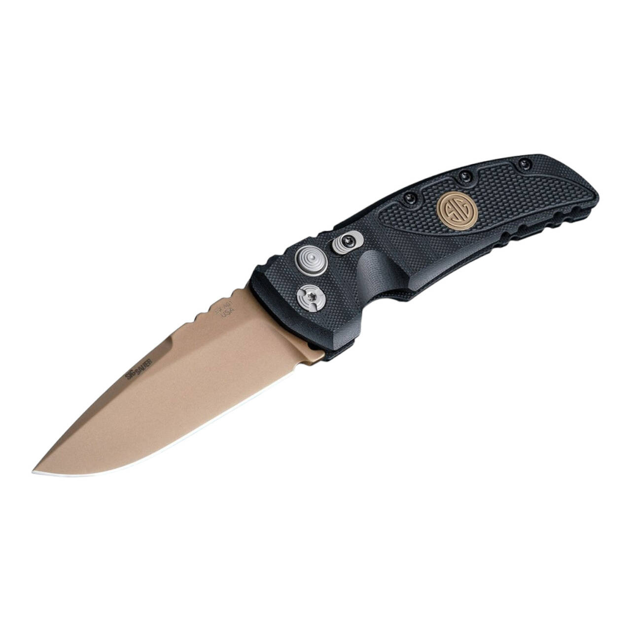 The EX-A01, manufactured by Hogue for SIG Sauer, is a convincing tactical knife, especially due to its sturdy construction and relatively low weight thanks to its G10 handle. The additional lock significantly increases safety. The blade is made of 154CM. With clip (tip-down).