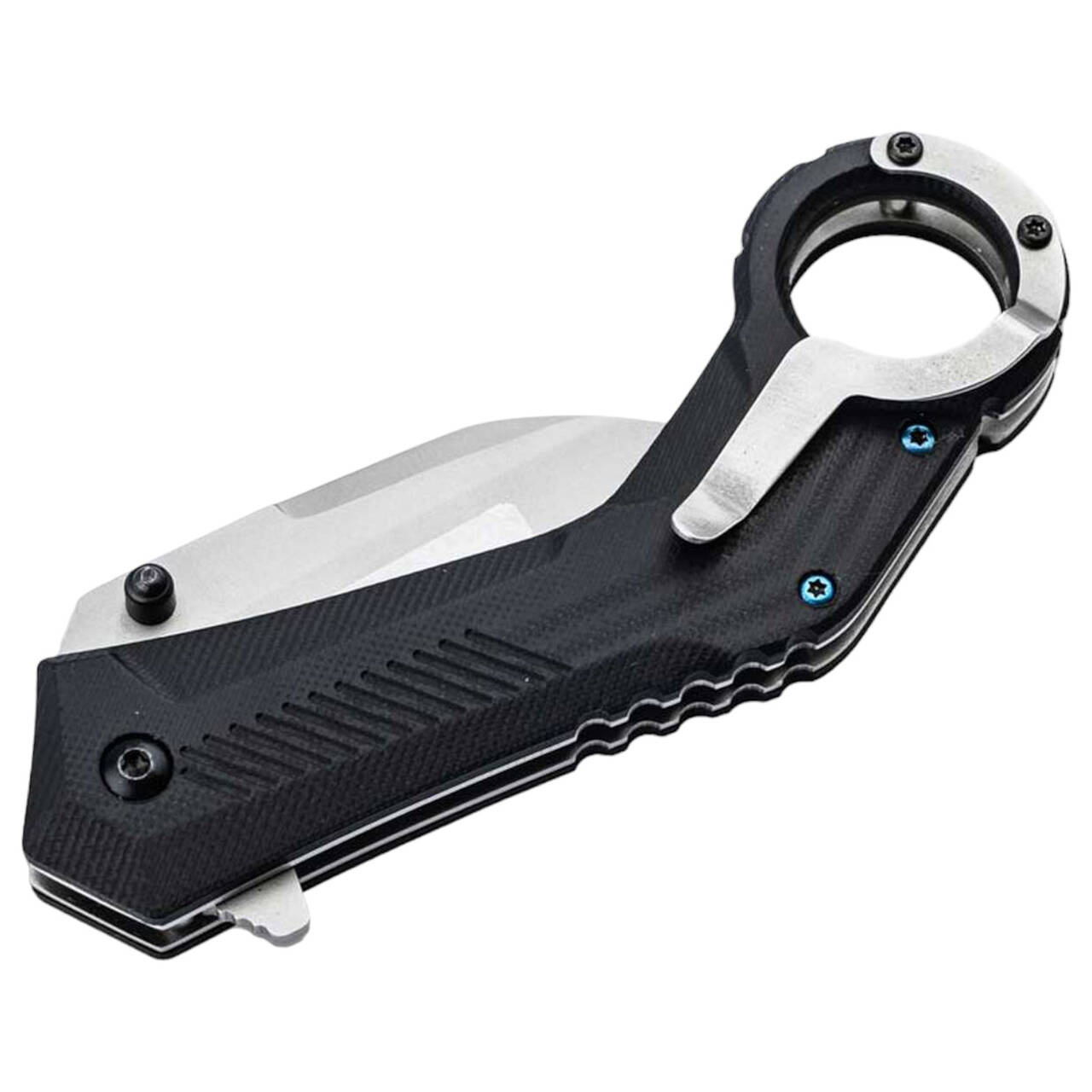 Fast, faster, Veloc! Boker gives the Magnum Veloc a boost and provides the Karambit knife with a spring-assisted opening mechanism. Flipper or optional thumb stud opens the aggressive 440B Wharncliffe blade with a bead blast finish with the necessary tailwind, while the linerlock reliably locks the assisted opener in place. The bent handle with textured G10 scales ensures an excellent grip and ends in the characteristic ring at the end of the handle, which was originally intended for attaching the knife to the little finger but is also used as a lanyard hole. Blue anodized elements such as the ring along the pivot screw and the handle screws add modern accents to the classic Southeast Asian knife shape. With tip-up clip (r).