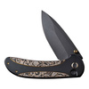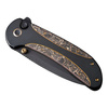 This is it, or in other words: Zizzit. WE Knife promises nothing less with this extravagant pocket knife, which has a ball-bearing drop-point blade with a black stonewash finish made from powder metallurgical CPM-20CV with compound grind and forms a dazzling harmony with the black titanium handle and copper-foiled carbon inlay. The EDC folder can be opened using either the flipper or thumb stud, while the button lock provides intuitive unlocking. With tip-up clip (r).