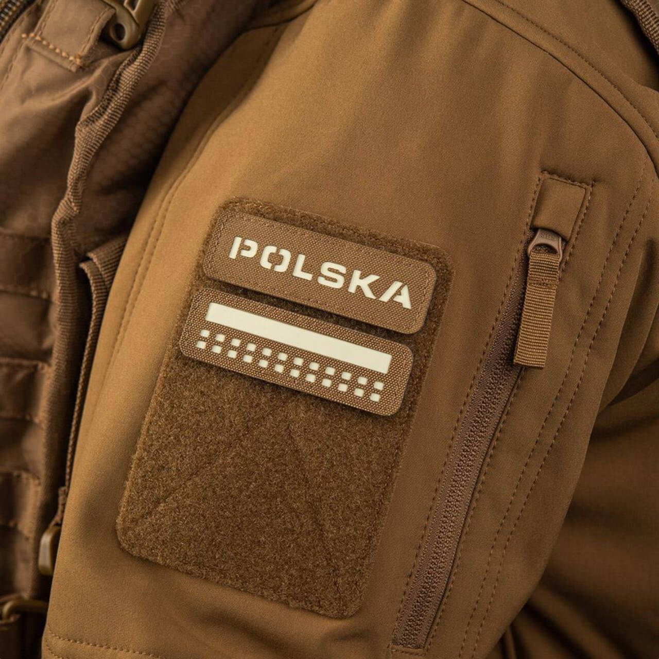 M-Tac patch representing the Polish flag with a modern pixel style. The patch is made of durable 500D Cordura material, printed with a fluorescent material that glows slightly in the dark. It is ideal for customizing clothing and accessories equipped with Velcro panels.