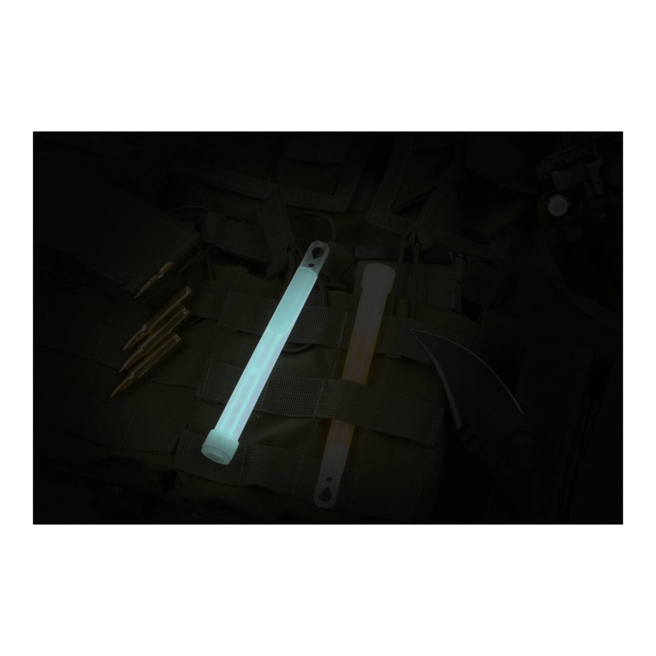 The 6" glow stick is a portable and cost-effective light source. Each lightstick is a collapsible plastic tube filled with two non-toxic chemical solutions, one held separately in a floating vial to prevent activation until needed. To activate, bend the tube and shake it. This bursts the vial and mixes the chemicals. A bright light is released by chemiluminescence, a chemical reaction that converts energy into light without heat, flame, or sparks. No batteries or light bulbs are needed. These glow sticks are suitable for various applications in combat, training, and outdoor activities.