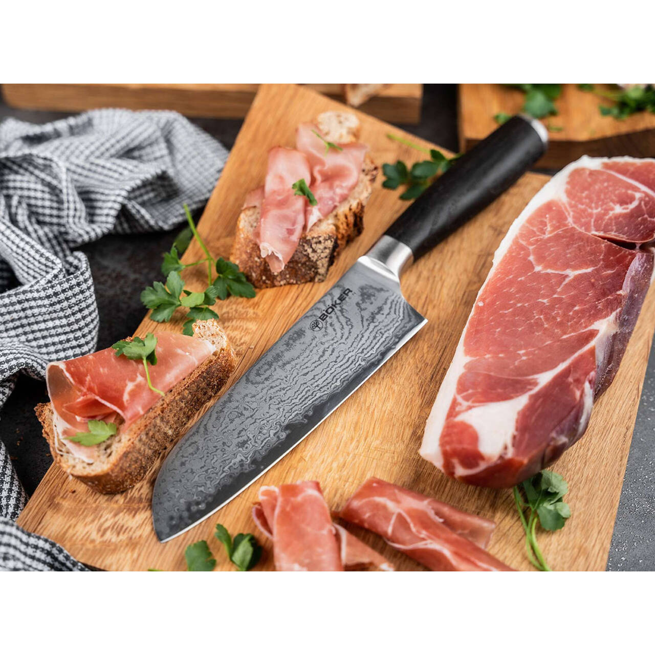 Cooking goes far beyond preparing food. Pure passion, seasoned with unlimited possibilities, creating unforgettable moments with family and friends. Cooking excites, and cooking brings people together. Philosophy as the perfect vitaminizing provider for inner balance. The premium series of Boker Meisterklinge Damast chef's knives shares this passion across the board: sovereign appearance, first-class hand position with harmonious balance, expressive without being ostentatious, and always with an individual touch, the exclusive kitchen knives guarantee the plus in pleasure. No more blunt knives: The finest Solingen knife workmanship from master craftsman's hands and high-quality materials in harmony for a fantastically sharp cutting experience - every day - again and again - and thanks to the free Boker re-sharpening service for a lifetime. The secret to outstanding sharpness lies in the hybrid blade, which combines the best of two worlds. The blade's core is made of solid and durable VG-10 steel, which makes the edge exceptionally sharp - and keeps it sharp for a long time, while the blade's protective sheath of multi-layered Damast provides the necessary flexibility, break resistance, and the ultimate cultivated look. Thus the knife glides almost effortlessly through ripe tomatoes and meat, with which even the demanding cutting of tender slices into large chunks inspires enthusiasm. Consistent, picturesque, and mountainous by nature: the dark handle made of smoked oak wood comes from the local forests of the Bergisches Land and makes the long Boker tradition tangible with every cut. The gently curved lines fit perfectly in the hand and convey a sure grip, balance, and typical Boker dynamism at all times. The high-quality look is complemented by the noble metal knob at the end of the handle, with the embedded Boker logo - a discreet statement of modesty. The chef's knives will be a faithful companion in the kitchen for years to come. Reliable, timeless, and carefree. Boker offers a lifetime warranty on materials and workmanship to keep it that way. That means less worry and more freedom for your culinary ideas. NO RISK, MORE FUN: Let us convince you of a masterful cutting experience and extensively test the Meisterklinge Damast series chef's knives at home with a 30-day money-back guarantee and free return shipping! Boker Meisterklinge Damast - a commitment where pleasure becomes a passion.