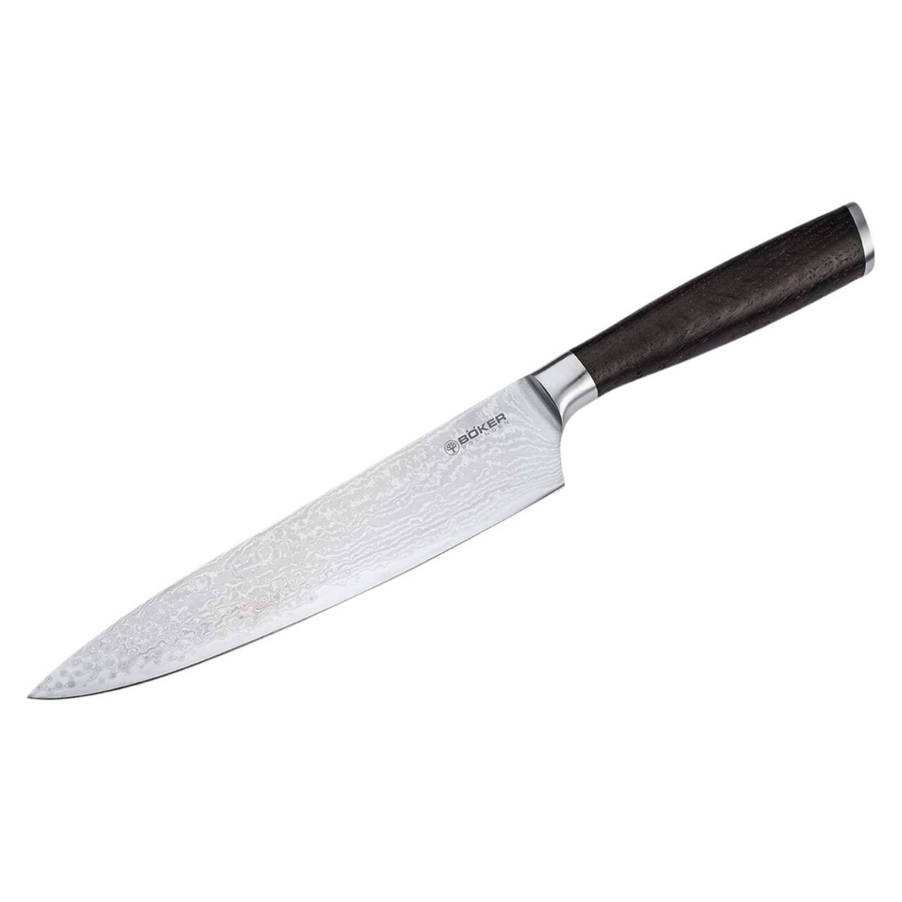 Cooking goes far beyond preparing food. Pure passion, seasoned with unlimited possibilities, creating unforgettable moments with family and friends. Cooking excites, and cooking brings people together. Philosophy as the perfect vitaminizing provider for inner balance. The premium series of Boker Meisterklinge Damast chef's knives shares this passion across the board: sovereign appearance, first-class hand position with harmonious balance, expressive without being ostentatious, and always with an individual touch, the exclusive kitchen knives guarantee the plus in pleasure. No more blunt knives: The finest Solingen knife workmanship from master craftsman's hands and high-quality materials in harmony for a fantastically sharp cutting experience - every day - again and again - and thanks to the free Boker re-sharpening service for a lifetime. The secret to outstanding sharpness lies in the hybrid blade, which combines the best of two worlds. The blade's core is made of solid and durable VG-10 steel, which makes the edge exceptionally sharp - and keeps it sharp for a long time, while the blade's protective sheath of multi-layered Damast provides the necessary flexibility, break resistance, and the ultimate cultivated look. Thus the knife glides almost effortlessly through ripe tomatoes and meat, with which even the demanding cutting of tender slices into large chunks inspires enthusiasm. Consistent, picturesque, and mountainous by nature: the dark handle made of smoked oak wood comes from the local forests of the Bergisches Land and makes the long Boker tradition tangible with every cut. The gently curved lines fit perfectly in the hand and convey a sure grip, balance, and typical Boker dynamism at all times. The high-quality look is complemented by the noble metal knob at the end of the handle, with the embedded Boker logo - a discreet statement of modesty. The chef's knives will be a faithful companion in the kitchen for years to come. Reliable, timeless, and carefree. Boker offers a lifetime warranty on materials and workmanship to keep it that way. That means less worry and more freedom for your culinary ideas. NO RISK, MORE FUN: Let us convince you of a masterful cutting experience and extensively test the Meisterklinge Damast series chef's knives at home with a 30-day money-back guarantee and free return shipping! Boker Meisterklinge Damast - a commitment where pleasure becomes a passion.