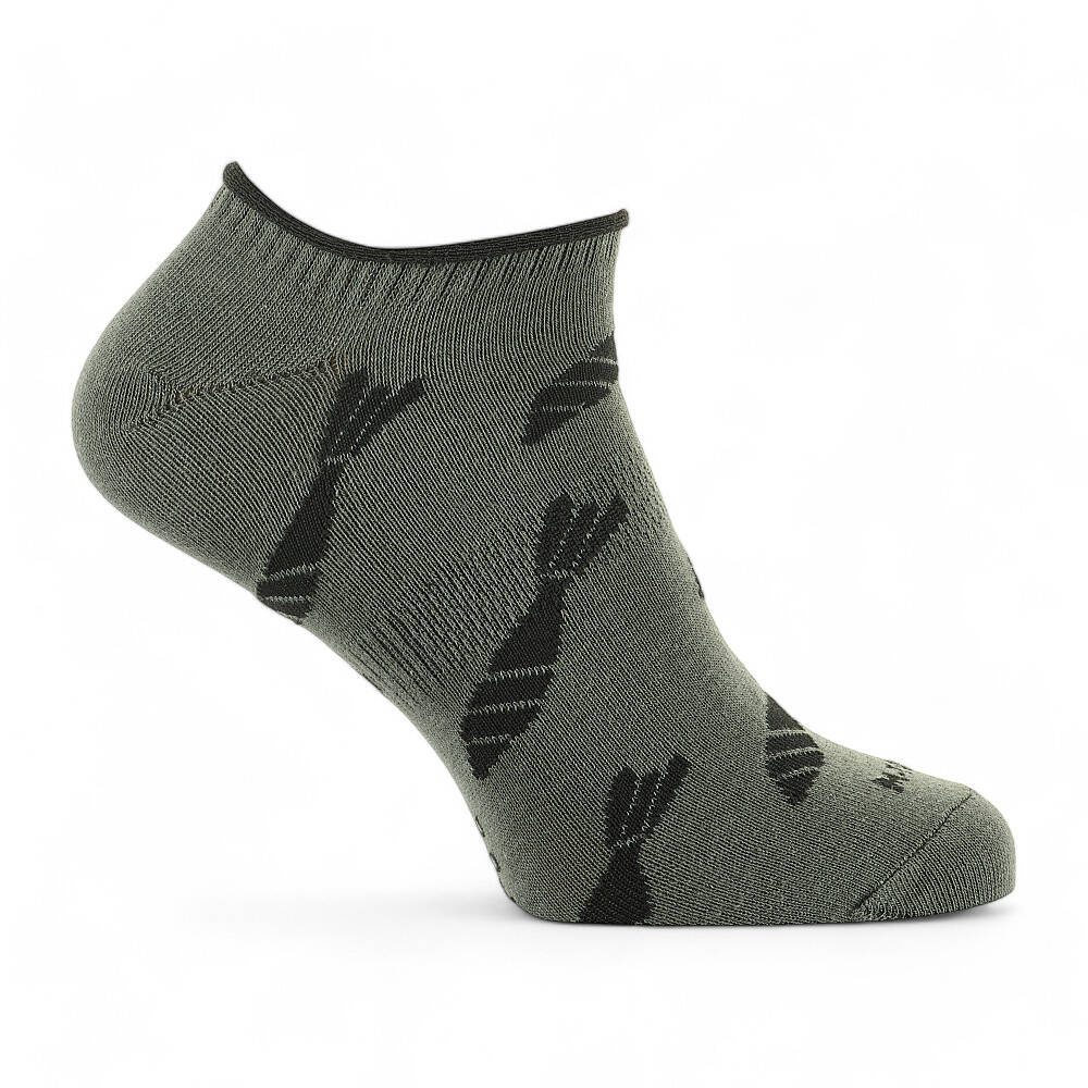 Made from lightweight, breathable fabric: 85% cotton, 10% polyester, 5% elastane. This textile composition ensures optimal thermoregulation, as a result of which the socks do not perspire. They have a shortened design with ergonomically placed pressure points, which ensure an optimal fit on the foot and are almost invisible in shoes. The Mortar Bombs pattern gives the socks an original look and the anatomical shape ensures a comfortable fit in the shoe.