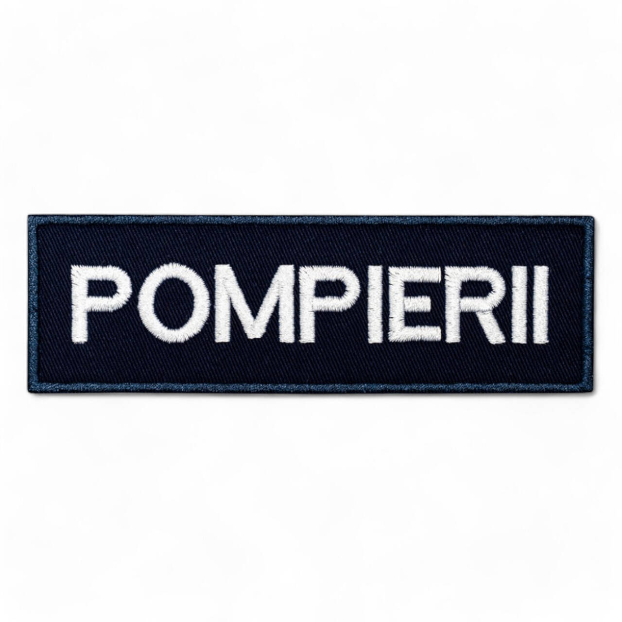 Emblema spate - POMPIERII - brodata pe suport negru cu contur bleumarin si text alb - aplicare termica - 20x5 cm