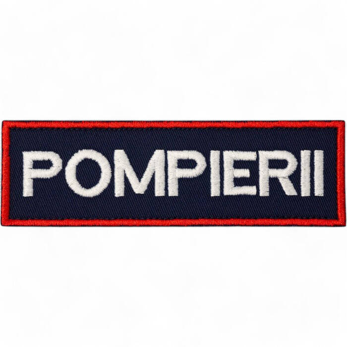 • Emblema spate - POMPIERII - brodata pe suport albastru inchis (navy) cu contur rosu si text alb - aplicare termica - 28x10 cm