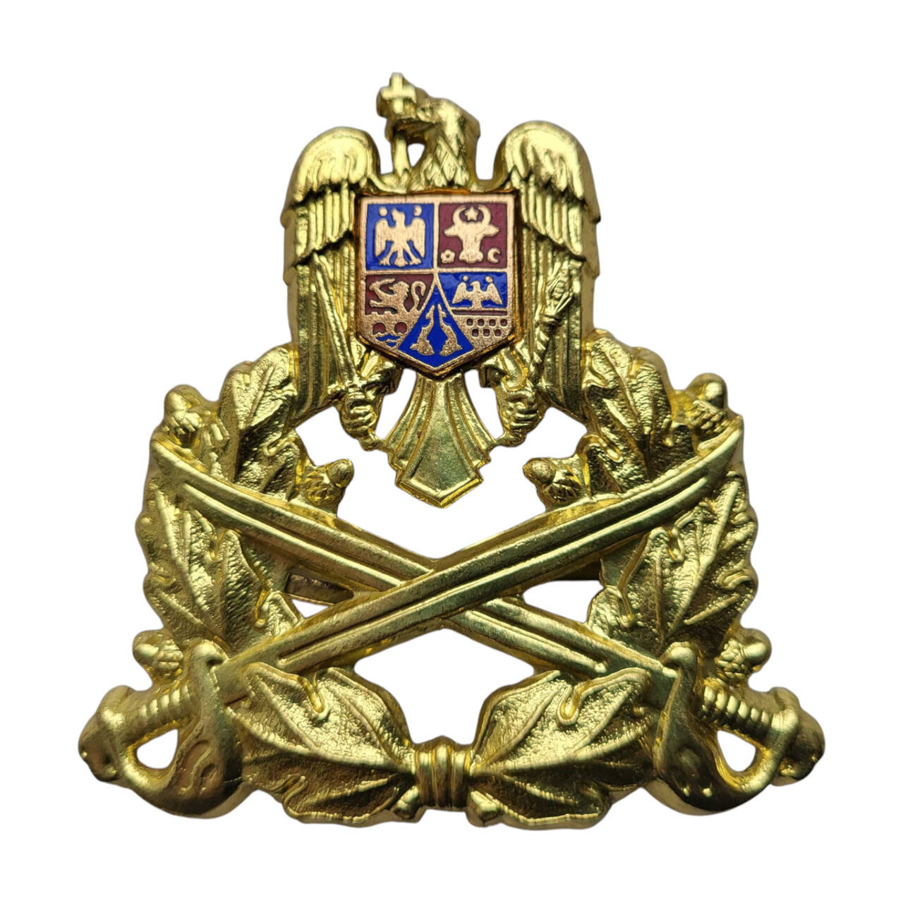 CAP BADGE - 90S INFANTRY - ROMANIAN ARMY MILITARY SURPLUS - GOLD - IN GOOD CONDITION