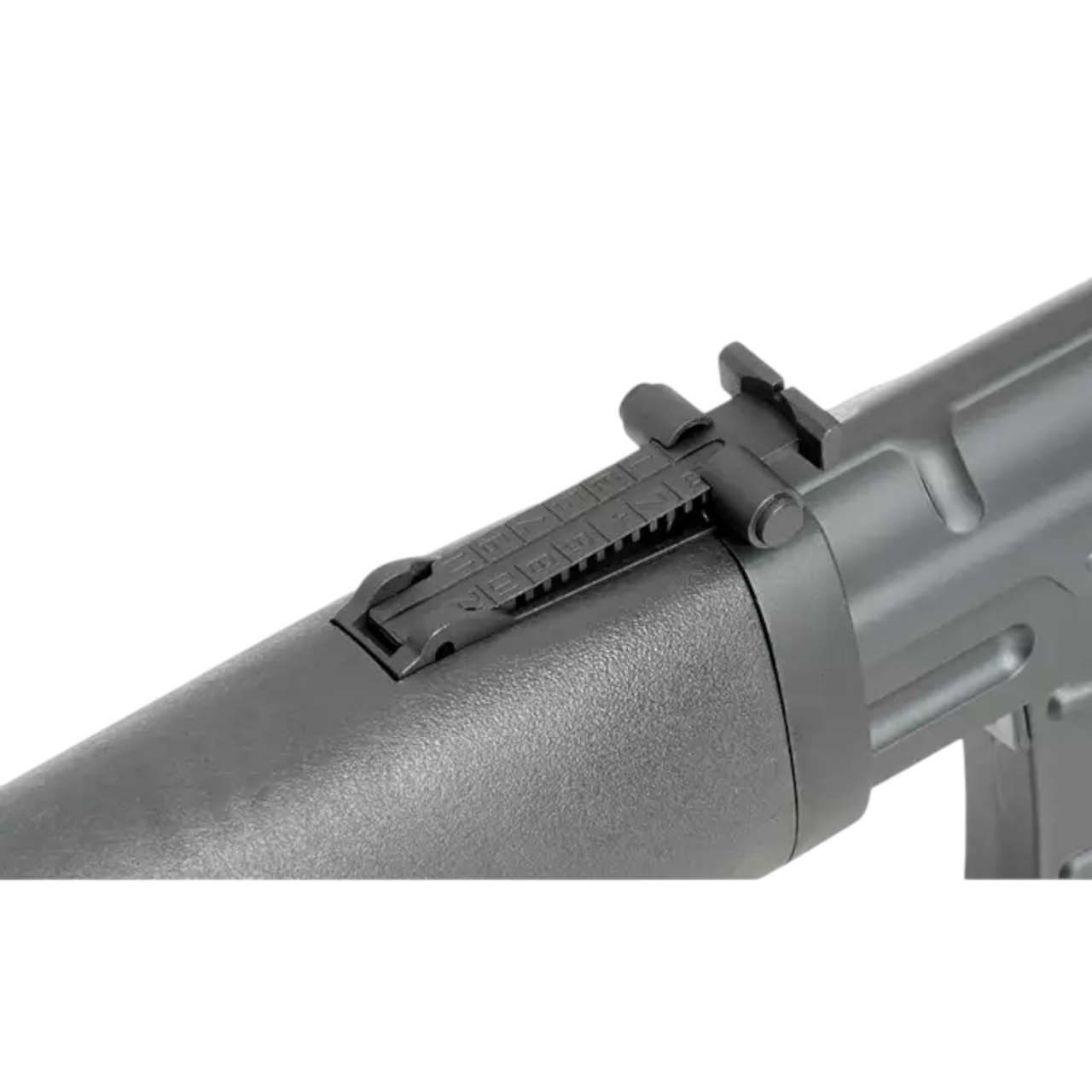 The replica's metal body, barrel, and front sight ensure durability, while the stock and front grip are made of durable plastic. It's worth noting that the stock is equipped with a cheek rest, known as a 'baker,' which improves the accuracy of the shot and comfort of handling.