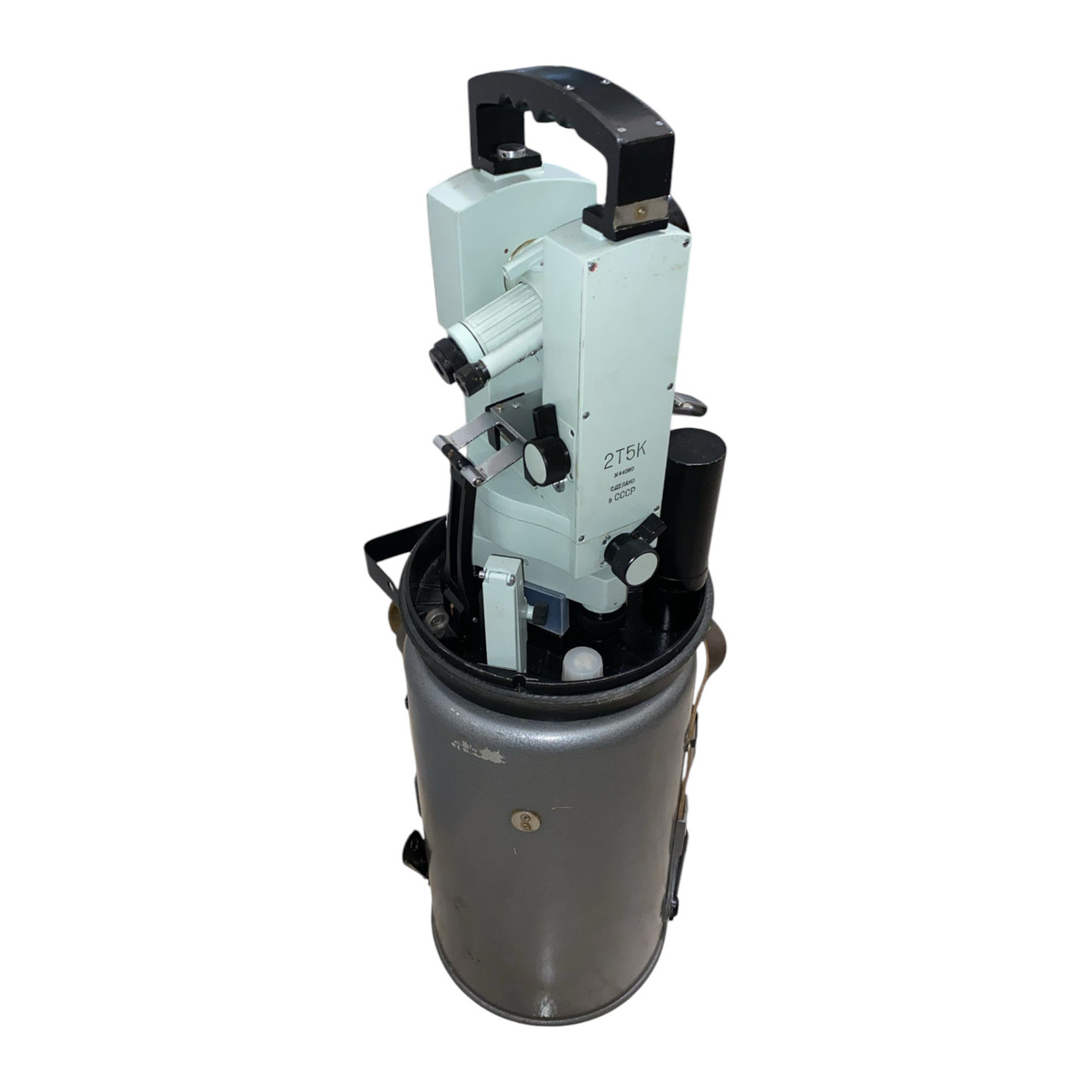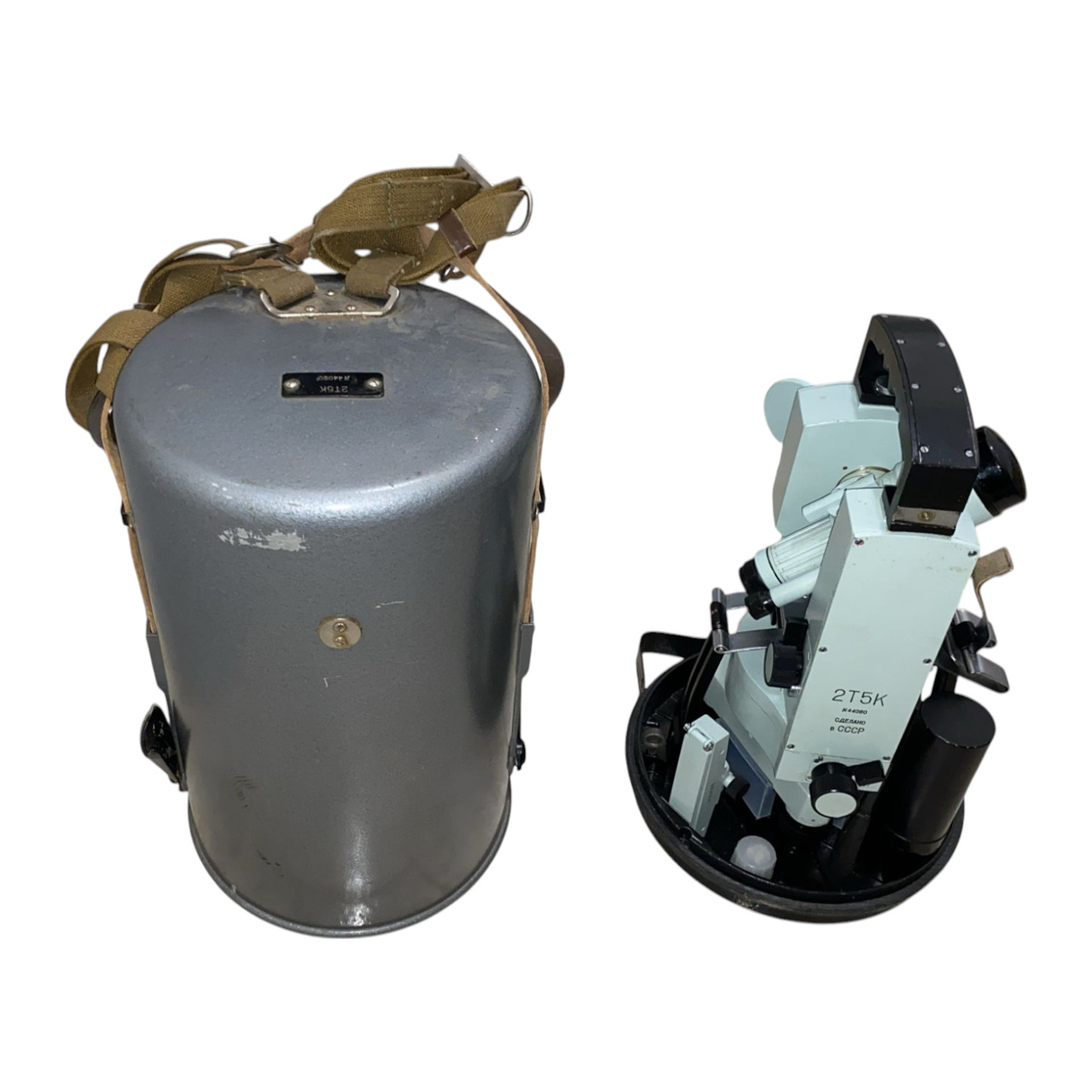 Theodolite manufactured in the USSR in the period 1970-1980, model 2T5K. It was also widely used in Romania at that time. The condition in the pictures, the used piece, seems to be complete, except for the maintenance and adjustment tools in the box, where it seems to have some small missing parts, and a defective hinge on one of the side flaps ( see photo ). I have not tested the functionality and the way it is calibrated, as I do not have the necessary knowledge.