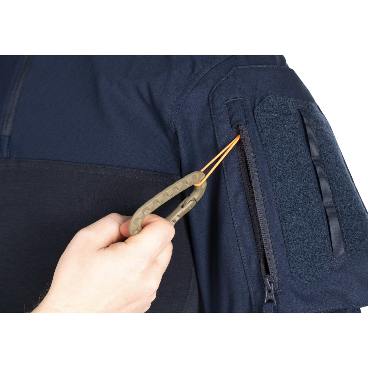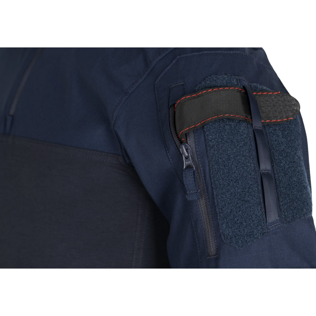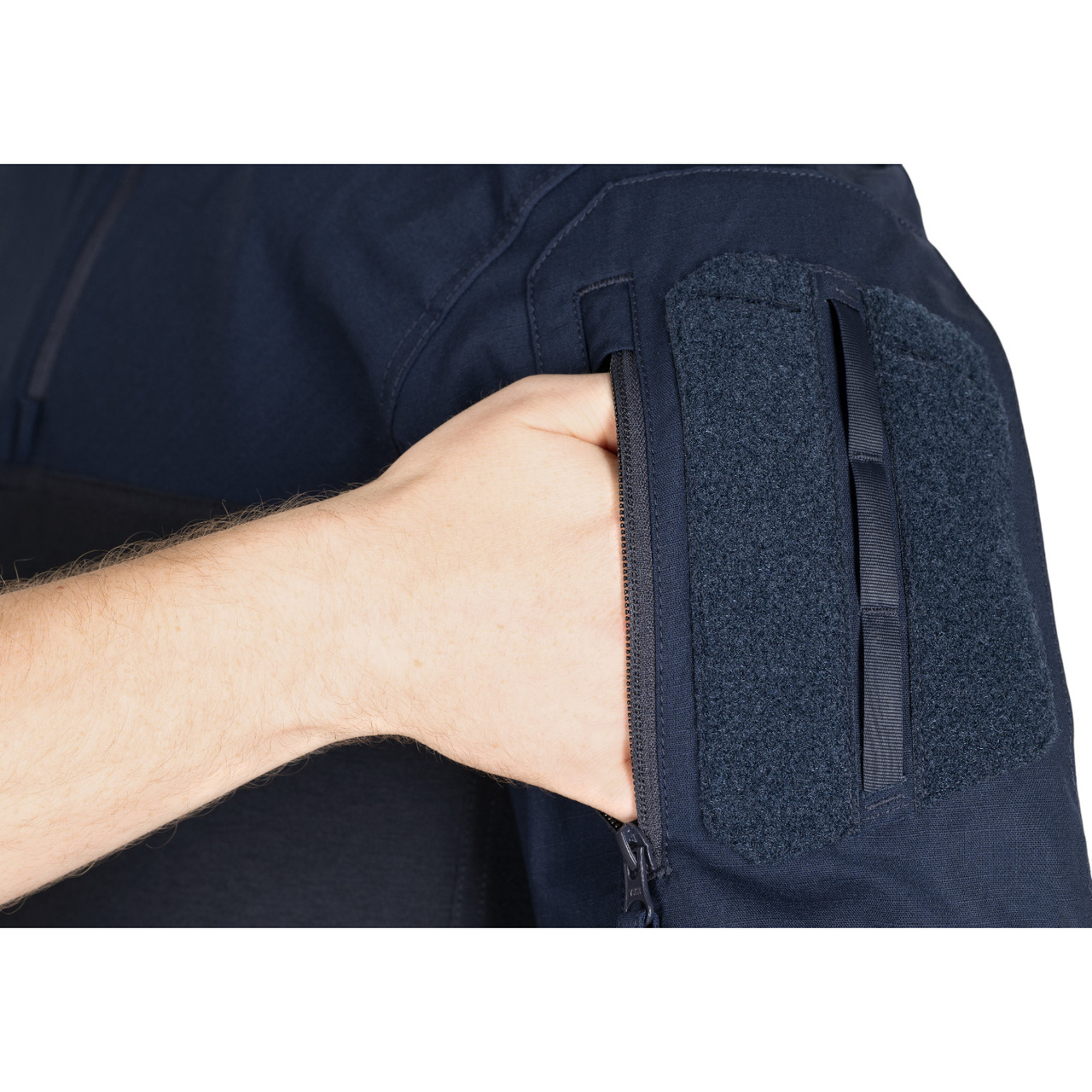 The elbow and outer forearm areas offer additional durability thanks to a ceramic coating applied to the NYCO main fabric. The large upper arm pocket is accessible via a zipper and allows gear to be secured with internal loops. Velcro patches and outer loops provide attachment points for IFF markers, V-LITE®, or even a tourniquet. Another Velcro patch is located at the back of the collar.