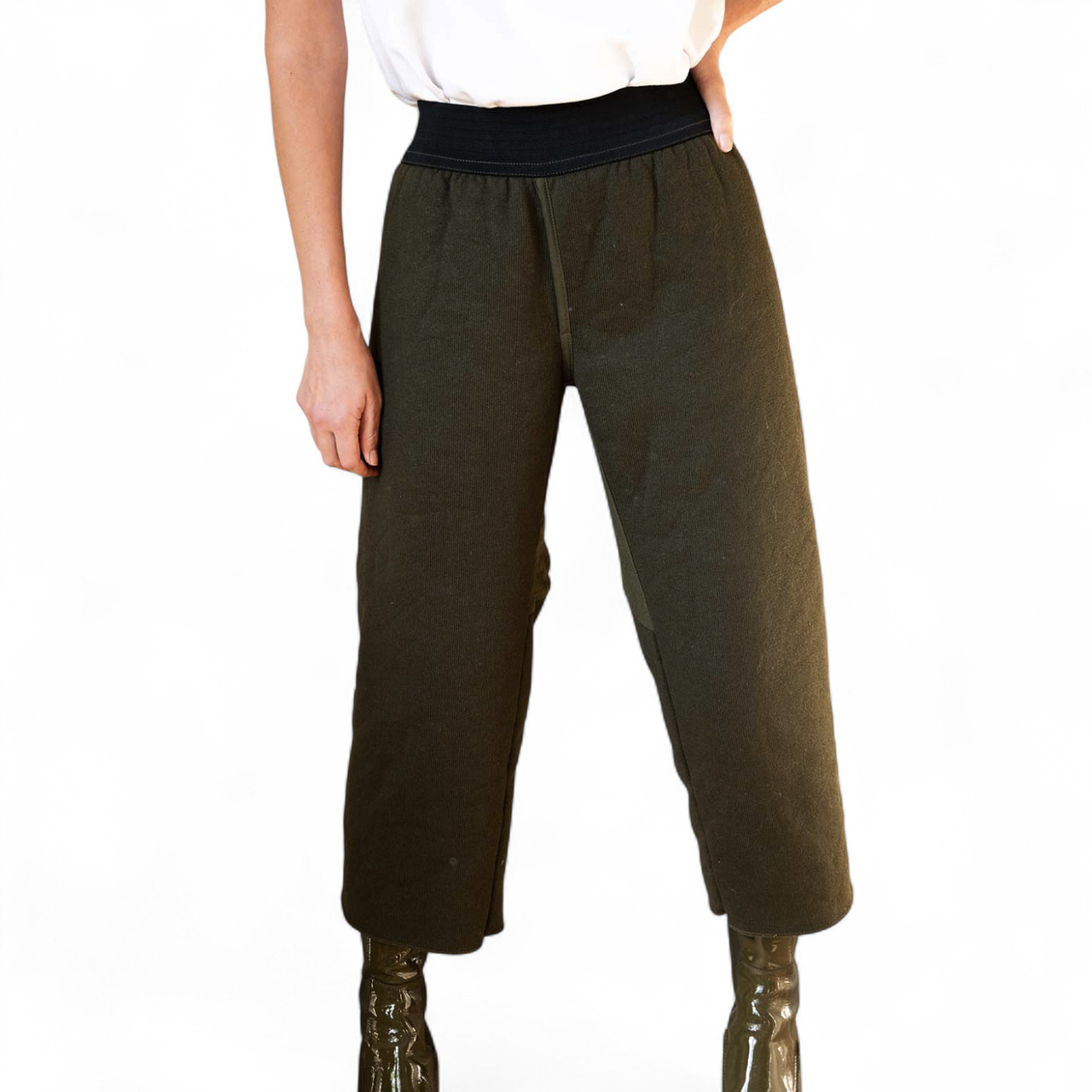 These jersey-style pants, lined with soft teddy-like fabric, are made in an Olive green hue. They were originally worn as an extra thermal layer on very cold days. Today, they can be worn with chunky boots, making them a practical and stylish choice for cold days.