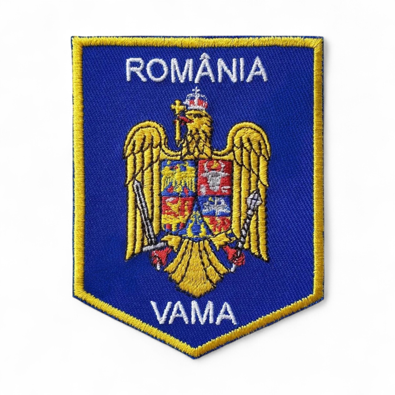 • Emblema scut Vama - 8,5 x 6,5 cm - Suport Albastru Royal - Cu aplicare prin coasere